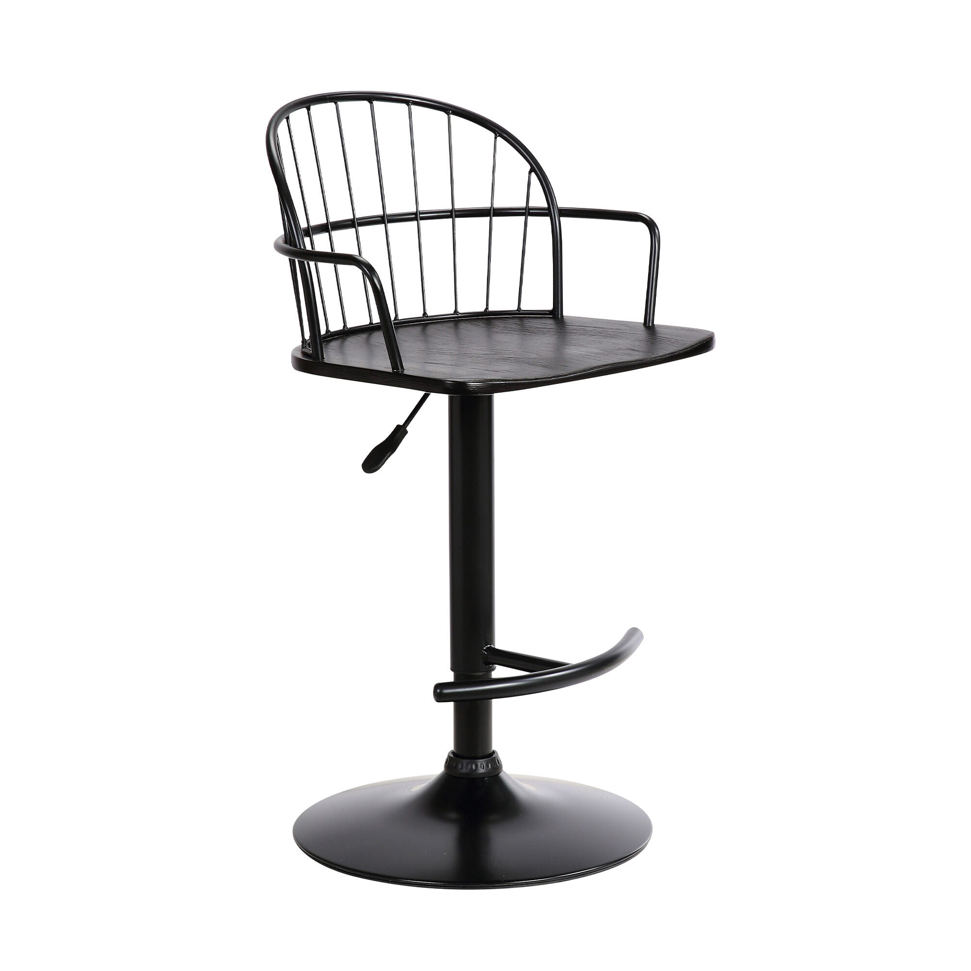 If you’ve always wanted a stylish bar seating in your home with enough functionality and design, this Black Wood and Metal Adjustable Curve Back Bar Stool is an excellent choice to consider. The stool is constructed from beautiful black metal with a black wooden seat that gives it a combination of rustic with a hint of modern industrial. The curved back has metal rods going across the back giving it an open and airy feel and then extends to the perfect height arm rests on either side. Simple yet functional, this all black bar stool also features a foot bar for convenient foot and leg support. 42.5″ x 18″ x 20″