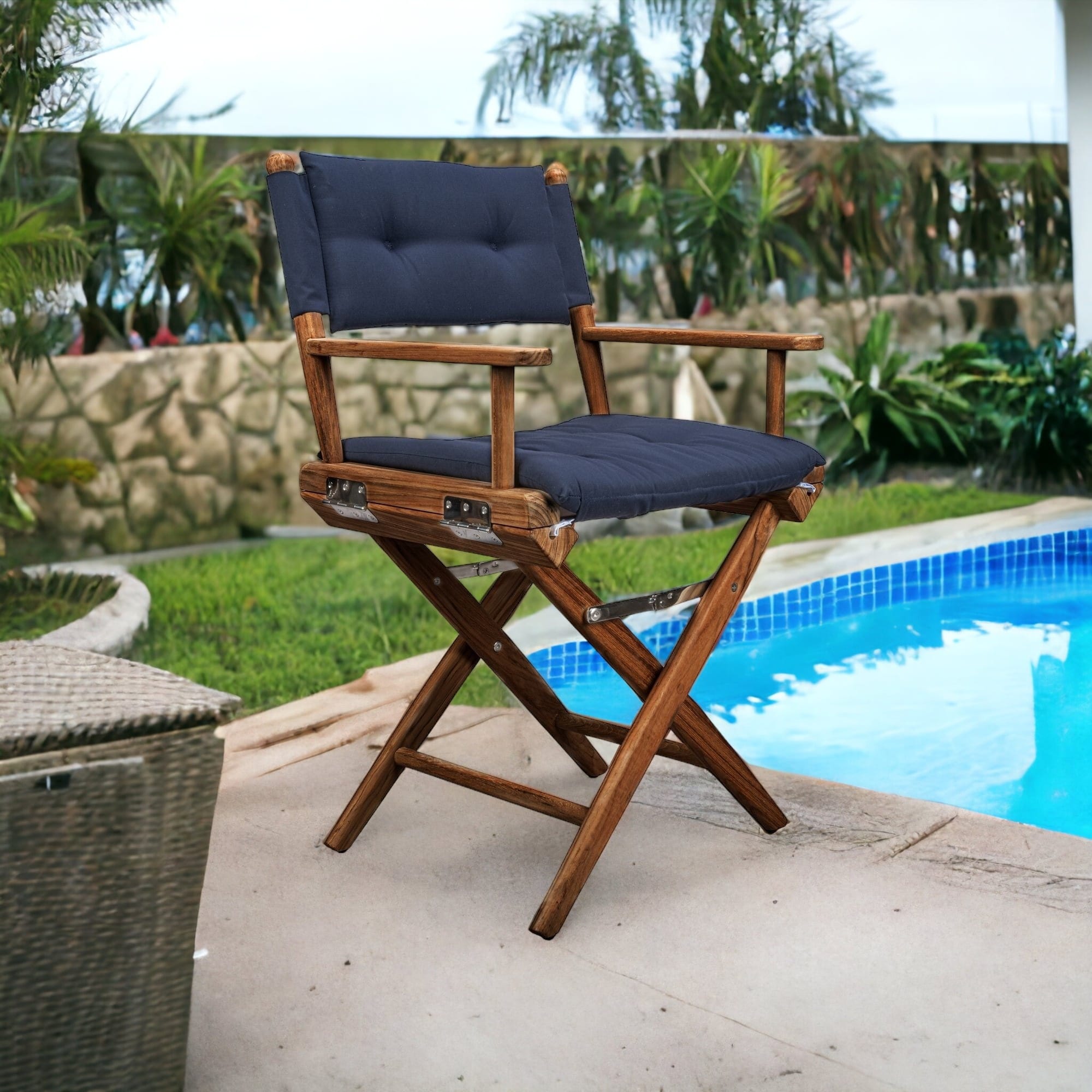 Channel your inner spielberg or scorsese as you sit tall and confident in the 23-inch navy blue and brown solid wood indoor outdoor director chair with navy blue cushion, making every moment feel like a cinematic masterpiece. Allow the enchanting brown color to leave a memorable impression and highlight your one-of-a-kind persona. Let these navy blue cushions be a vibrant expression of your personal style, infusing your living area with colors that perfectly resonate with your aesthetic. Arms give this chair shape and definition and make it a good looking and comfortable option. Enjoy the good life everyday with this fashionable outdoor seating option. 33.5-inch H x 23-inch W x 17.5-inch D