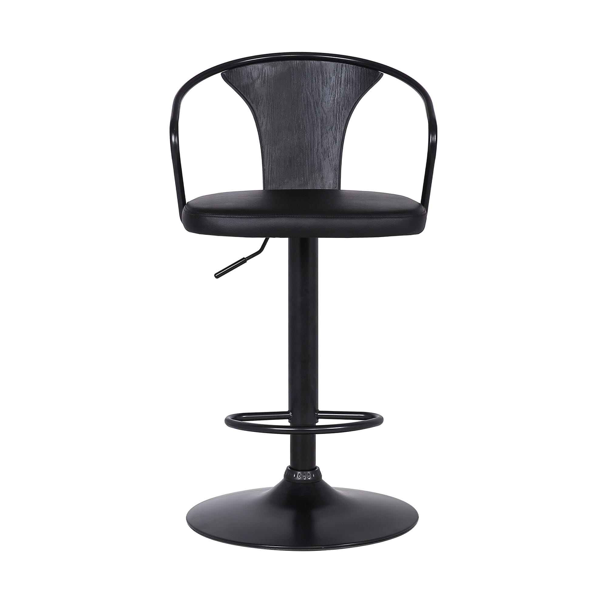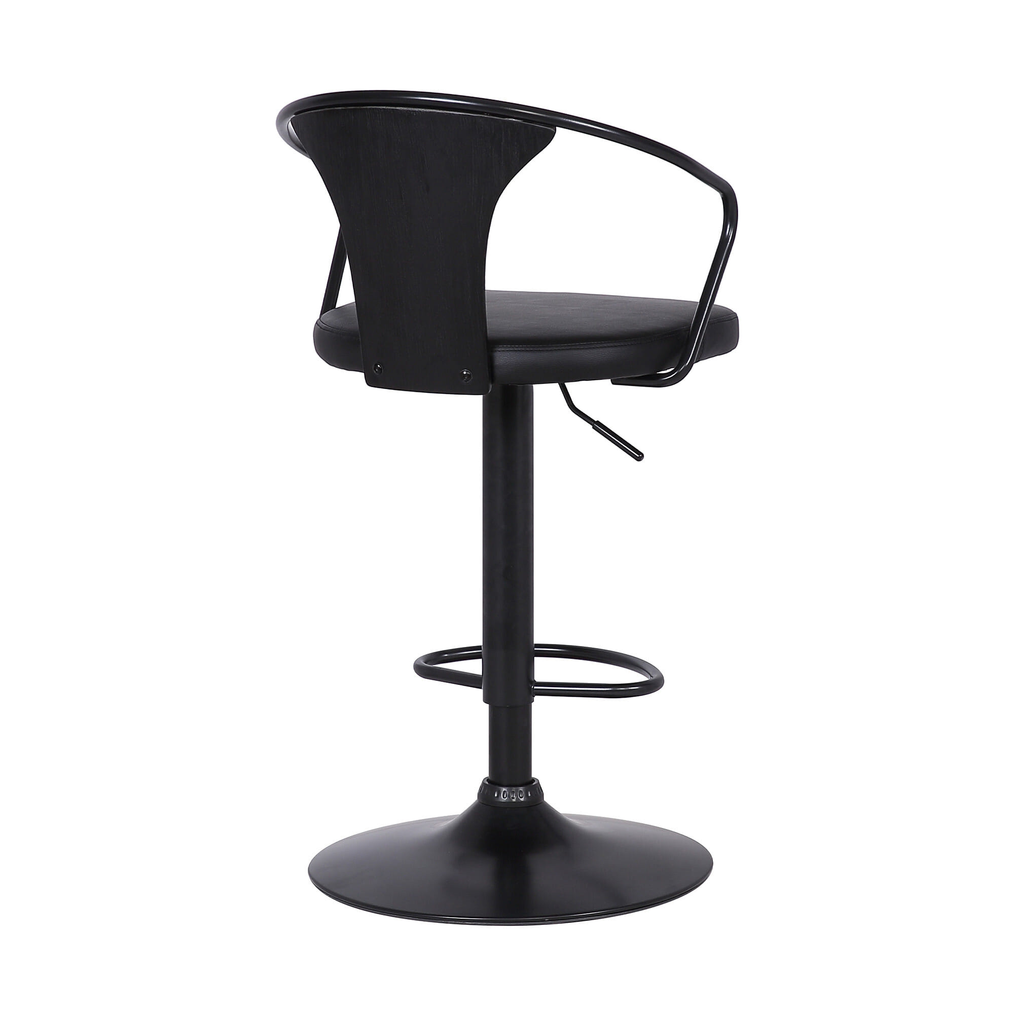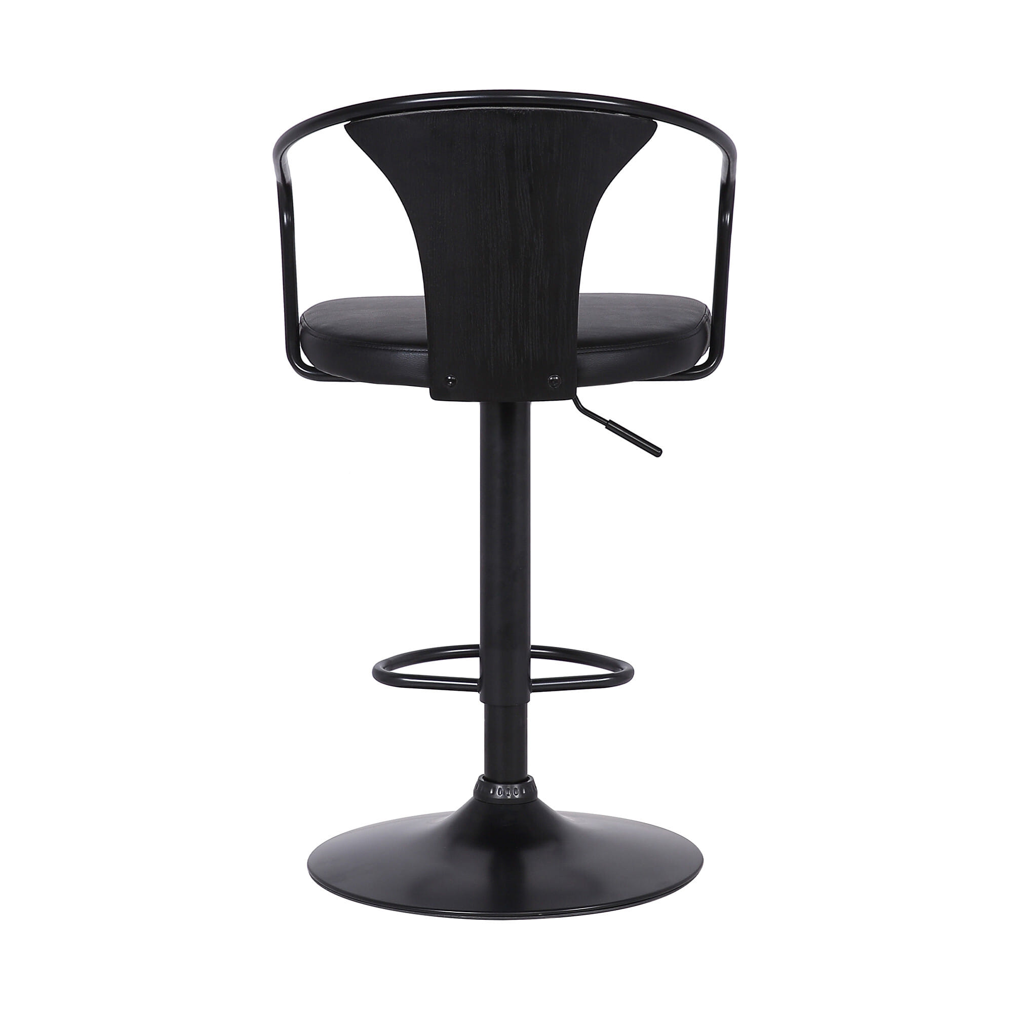 Transform your modern home with this Black Faux Leather & Metal Base Adjustable Bar Stool to have a polished aesthetic. The effortless design of the stool is the archetype of modern-day décor that exudes a dapper vibe in any room. The stool provides plenty of mobility since it rotates 360-degrees in all directions with ease. Fashioned out of steel and leather, the stool is sturdy and meant for regular usage without losing its shine or structure. The black metal base is the heart of the stool and the faux leather cushion in black adds a stylish edge to the piece. Adjustable height is another feature of the stool since it can shift between 34.5 inches and 43 inches. Whether you want to vamp up the look of your home office or living room, this chic piece of furniture is the way to do it. 43″ x 20″ x 19″
