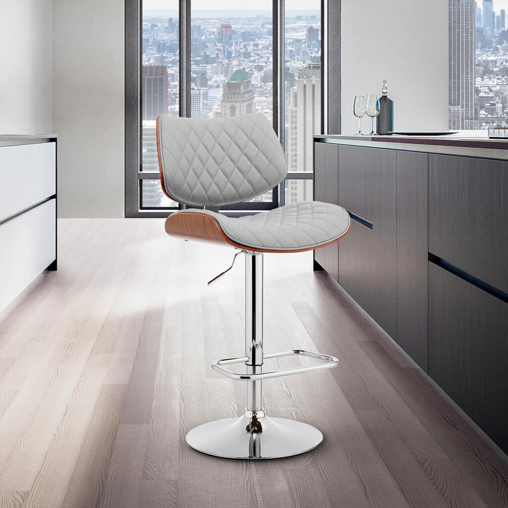 Comfort and design come together nicely in this 45″ gray faux leather and iron swivel adjustable height bar chair. A chrome iron frame is finished off with a gray faux leather seat that is the epitomy of quality construction and design. Not only good looking and stylish, this chair features a round shaped seat and a full back for the ultimate in comfort and enjoyment. This stool will look great in your dining room, kitchen, bar, or recreation room. 45″ H x 19″ W x 20″ D