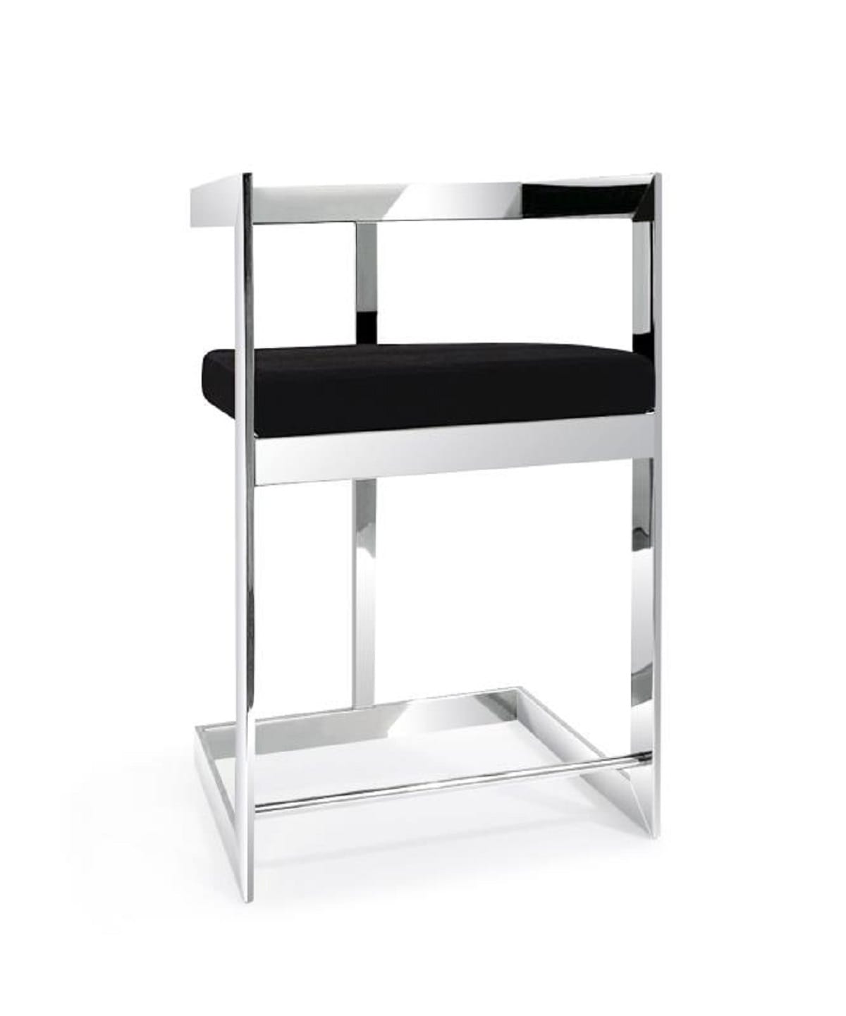 With this 26-inch black and silver velvet and stainless steel low back counter height bar chair you can add design and extra seating to your space. The silver coloration of the high quality stainless steel base marries nicely with the black velvet seat. The rectangle shape of the seat combines with a low back to give this chair a comfortable and fashionable look. Designed with armrests for your comfort, this chair also features a footrest for comfort and convenience. 36-inch H x 19-inch W x 16-inch D