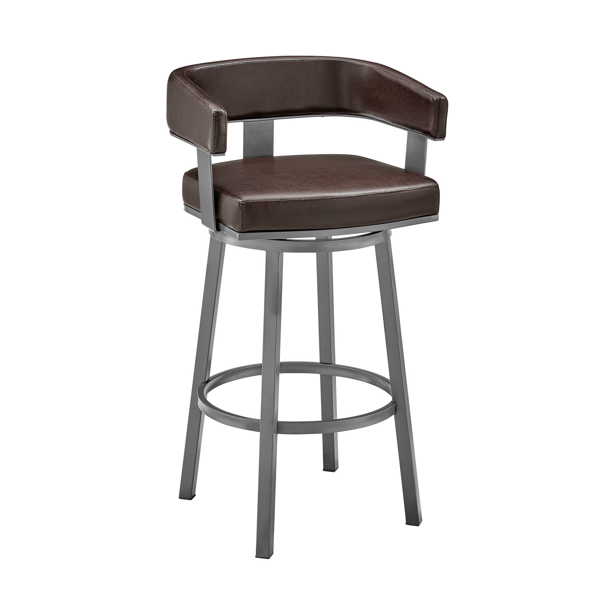 Bring a trendy bar vibe to your space, with this 26-inch chocolate and gray faux leather and iron swivel low back counter height bar chair with footrest. The base of this stool is made from iron in a gray color that is a nice contrast to the chocolate faux leather seat. A low back mixed with a round shaped seat design makes this chair both comfortable and fashionable. Designed with armrests for your comfort, this chair also features a footrest for comfort and convenience. 34-inch H x 22-inch W x 20-inch D