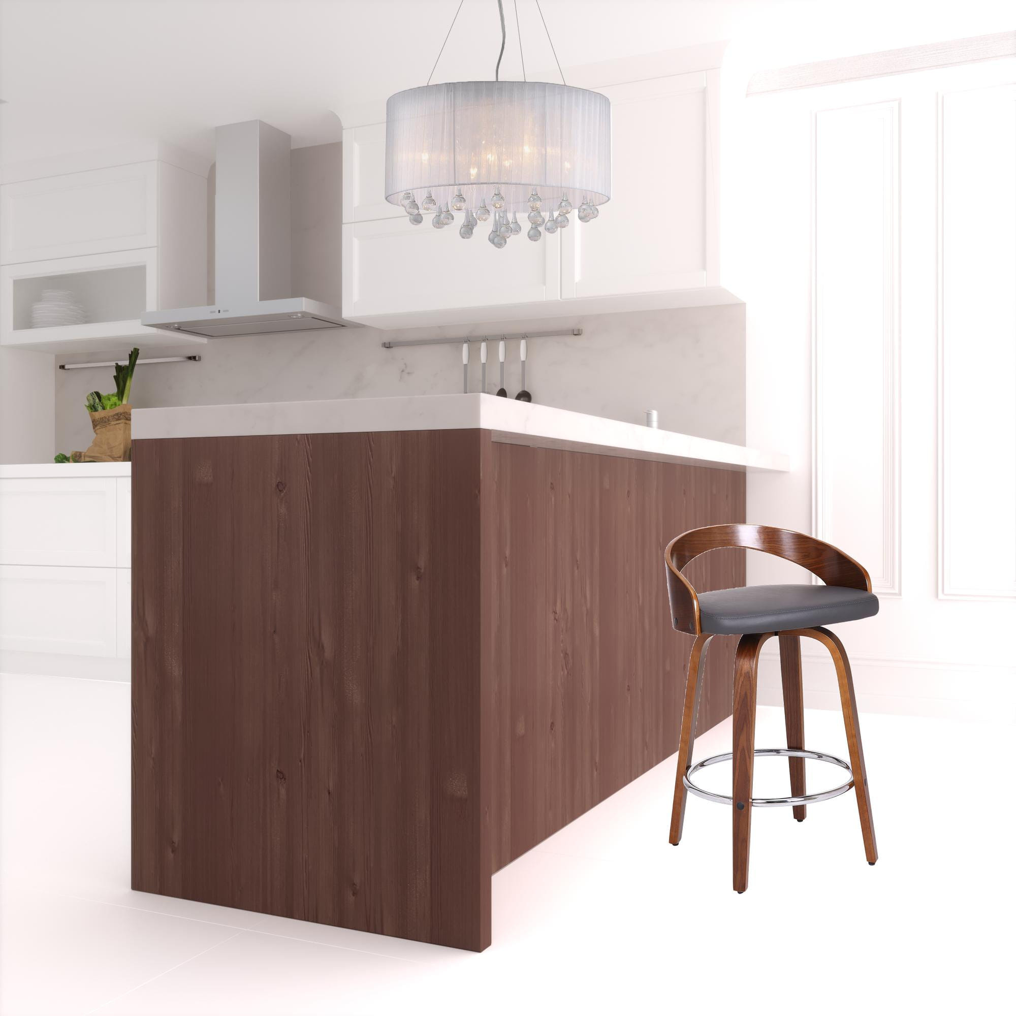 Comfort and design come together nicely in this 26-inch gray and brown faux leather and iron low back counter height swivel bar chair. The base of this stool is made from iron in a brown color that is a nice contrast to the gray faux leather seat. A low back mixed with a round shaped seat design makes this chair both comfortable and fashionable. Designed with a footrest for comfort and convenience. 31-inch H x 19-inch W x 19-inch D