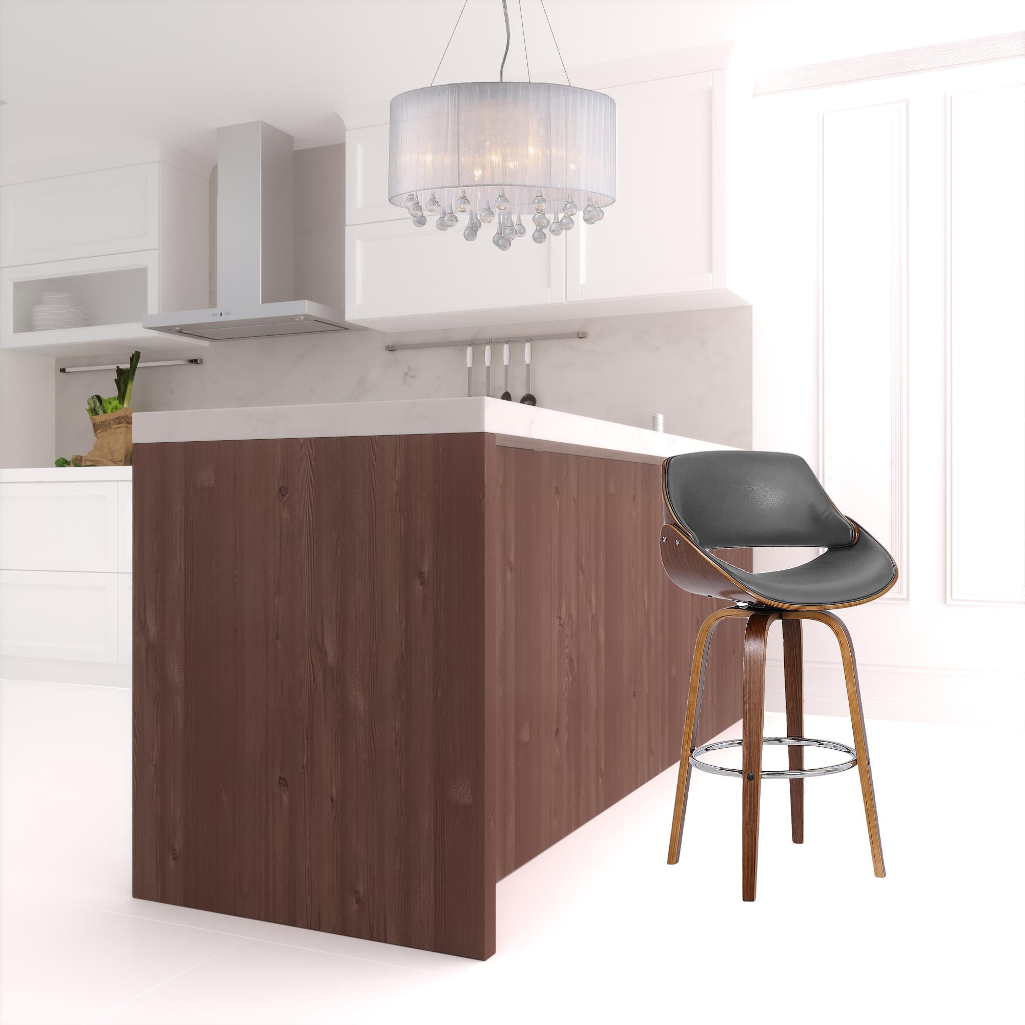 Comfortable enough to sit in for awhile, this 26-inch gray and brown faux leather and iron swivel low back counter height bar chair will transcend the look of your room. Quality construction from brown iron combines with gray faux leather to give this stool a fresh and updated look. The round shape of the seat combines with a low back to give this chair a comfortable and fashionable look. Designed with a footrest for comfort and convenience. 37.5-inch H x 20.5-inch W x 19.5-inch D