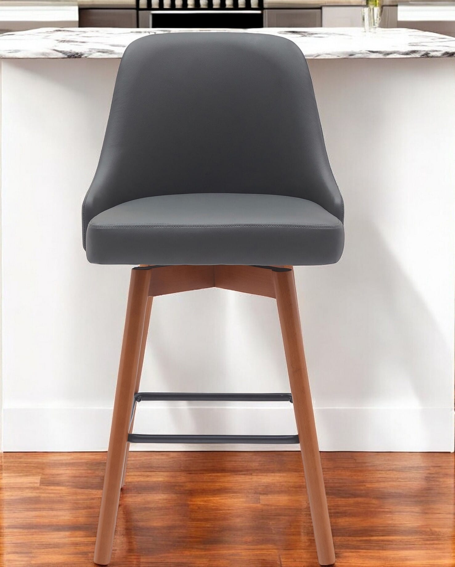 The perfect way to add some extra seating in your home, this 26-inch gray and wood brown faux leather and solid wood swivel counter height bar chair will elevate the look and vibe of your room. Quality construction from wood brown solid wood combines with gray faux leather to give this stool a fresh and updated look. Not only good looking and stylish, this chair features a bucket shaped seat and a full back for the ultimate in comfort and enjoyment. Designed with a footrest for comfort and convenience. 37.5-inch H x 20.5-inch W x 19-inch D