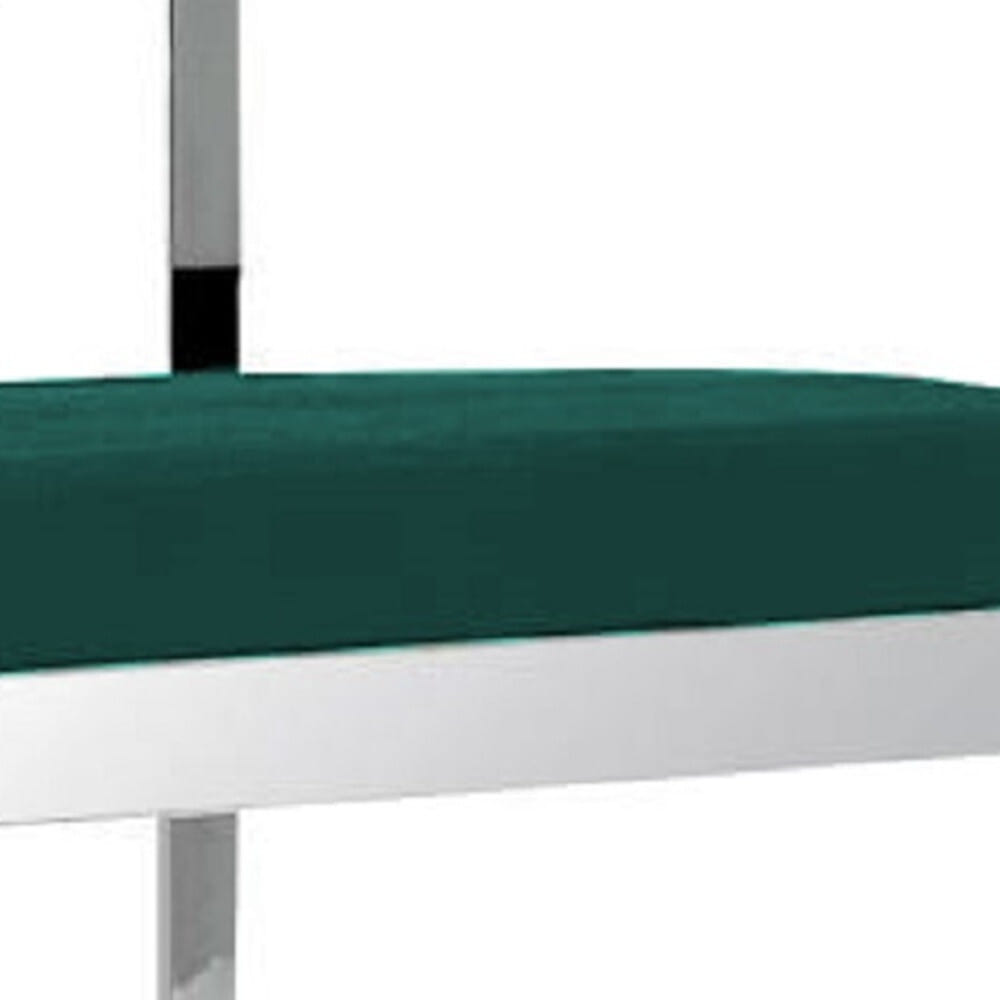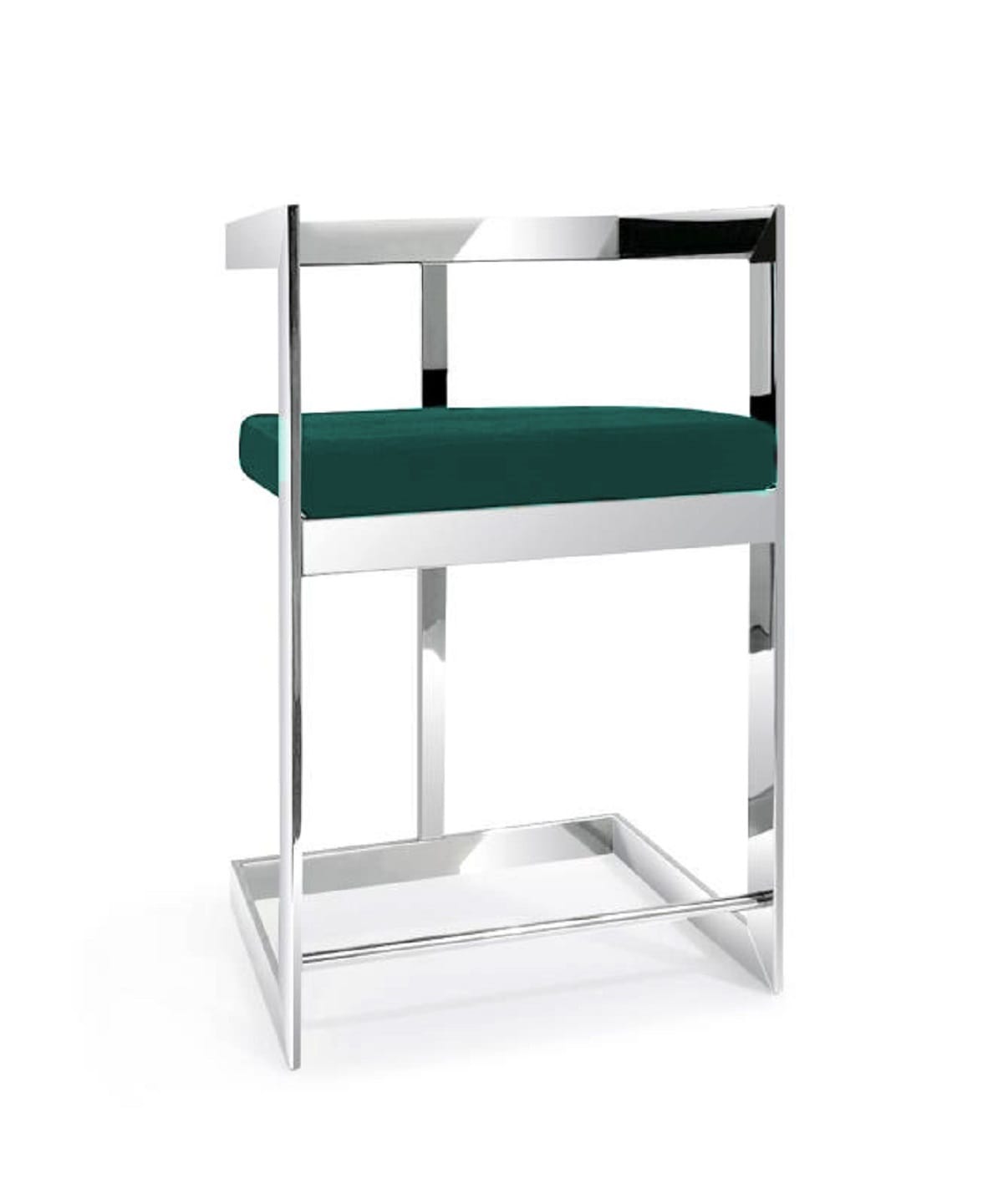 The perfect way to add some extra seating in your home, this 26-inch green and silver velvet and stainless steel low back counter height bar chair will elevate the look and vibe of your room. The base of this stool is made from stainless steel in a silver color that is a nice contrast to the green velvet seat. The rectangle shape of the seat combines with a low back to give this chair a comfortable and fashionable look. Designed with armrests for your comfort, this chair also features a footrest for comfort and convenience. 36-inch H x 19-inch W x 16-inch D