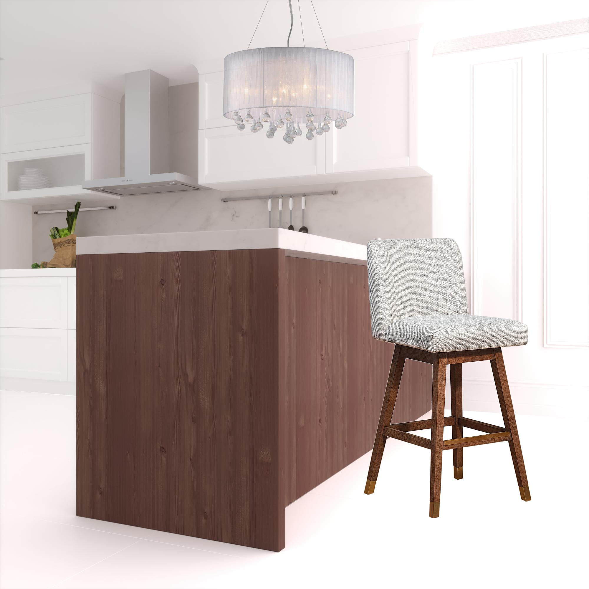 This 30-inch beige and brown upholstered and solid wood swivel bar height bar chair will be the perfect way to add some cool design and utility to your space similar to what you find in your favorite cafes or pubs. The wood brown coloration of the high quality solid wood base marries nicely with the beige upholstered seat. Not only good looking and stylish, this chair features a rectangle shaped seat and a full back for the ultimate in comfort and enjoyment. Designed with armrests for your comfort, this chair also features a footrest for comfort and convenience. 40.5-inch H x 22.5-inch W x 19-inch D