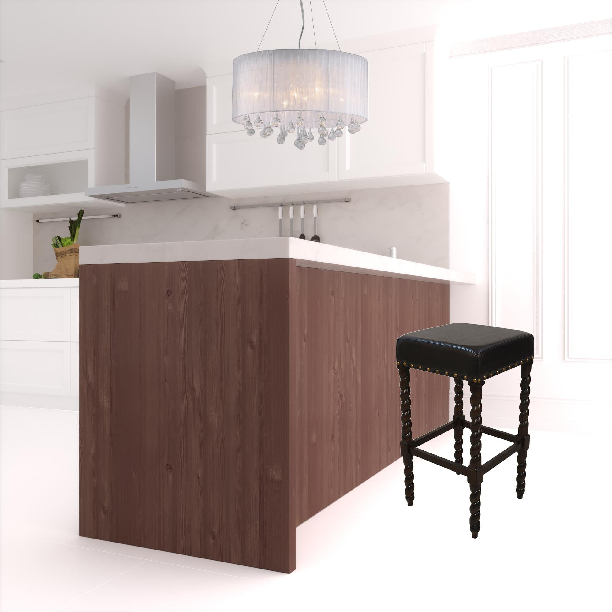 Comfort and design come together nicely in this 30-inch black and espresso faux leather and solid wood backless bar height bar chair. The base of this stool features twisted/turned legs made from solid wood in a dark espresso brown color that is a nice contrast to the black faux leather seat. Designed to be good looking and practical, this backless bar chair features a square shaped seat. Designed with a footrest for comfort and convenience. 30-inch H x 16.375-inch W x 16.375-inch D