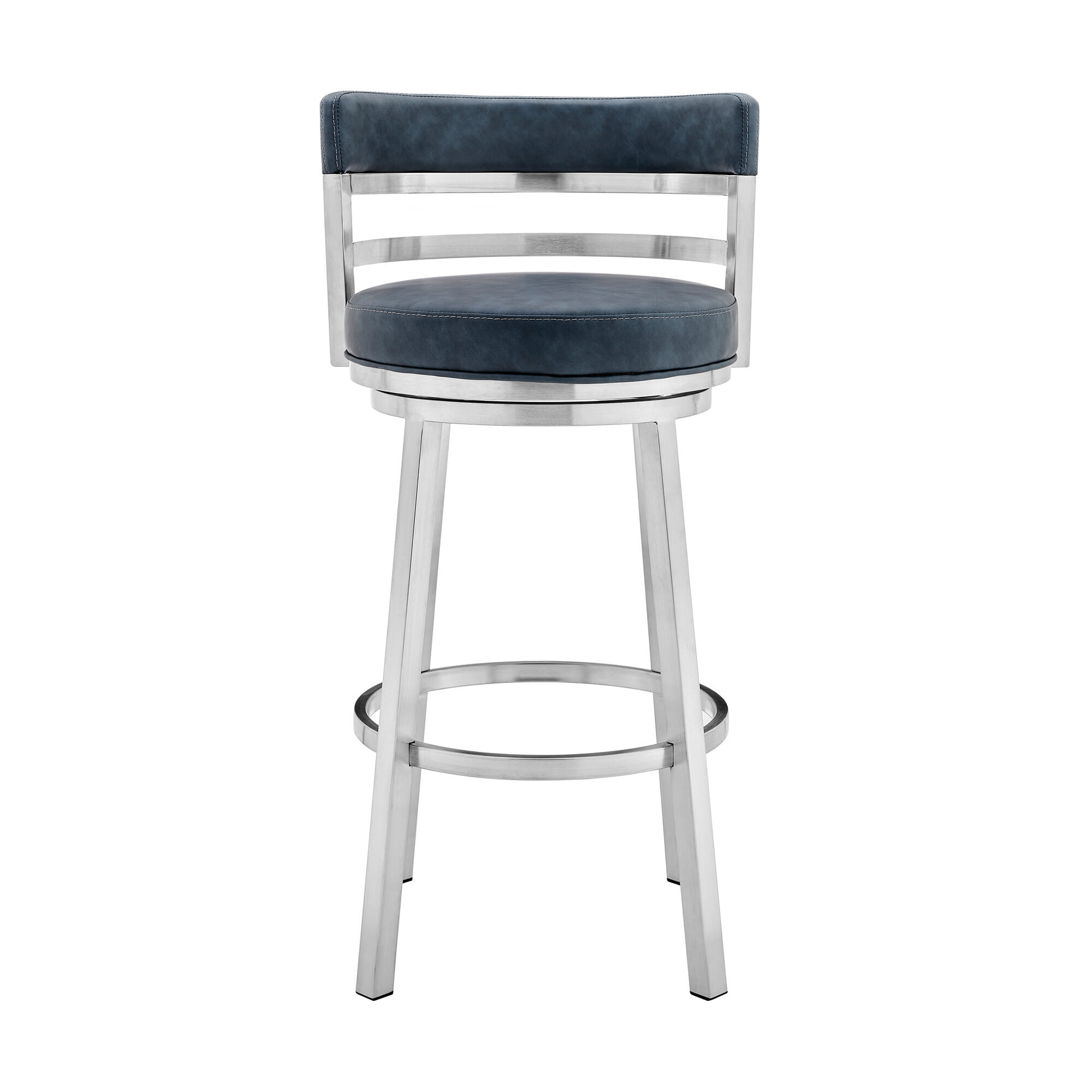 30″ Blue And Silver Faux Leather And Iron Swivel Low Back Bar Height Bar Chair