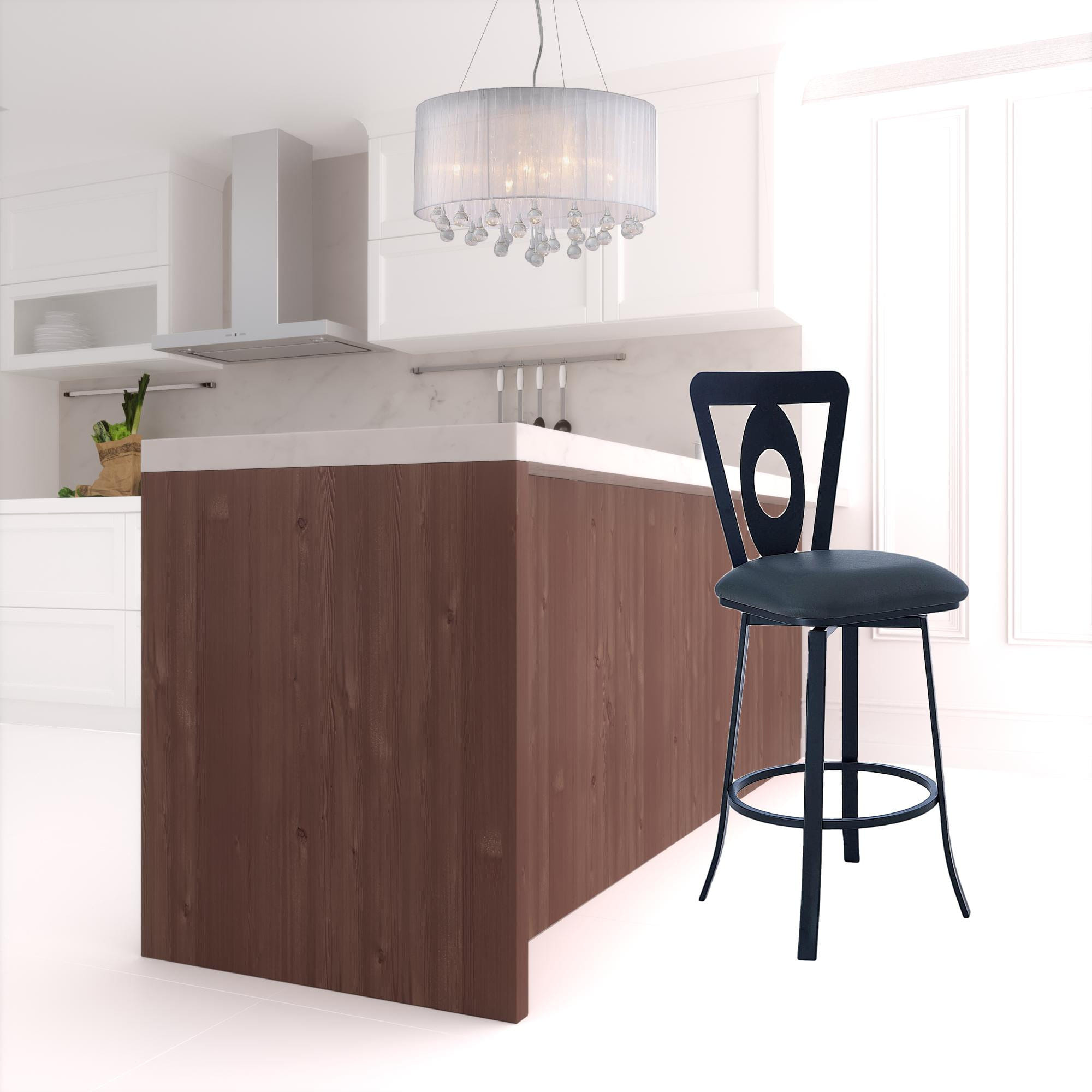 Comfortable enough to sit in for awhile, this 46″ gray faux leather and iron swivel bar height chair will transcend the look of your room. Quality construction from matte black iron combines with gray faux leather to give this stool a fresh and updated look. The round shape of the seat combines with a full back to give this chair a comfortable and fashionable look. This stool will look great in your dining room, kitchen, bar, or recreation room. 46″ H x 21″ W x 18″ D