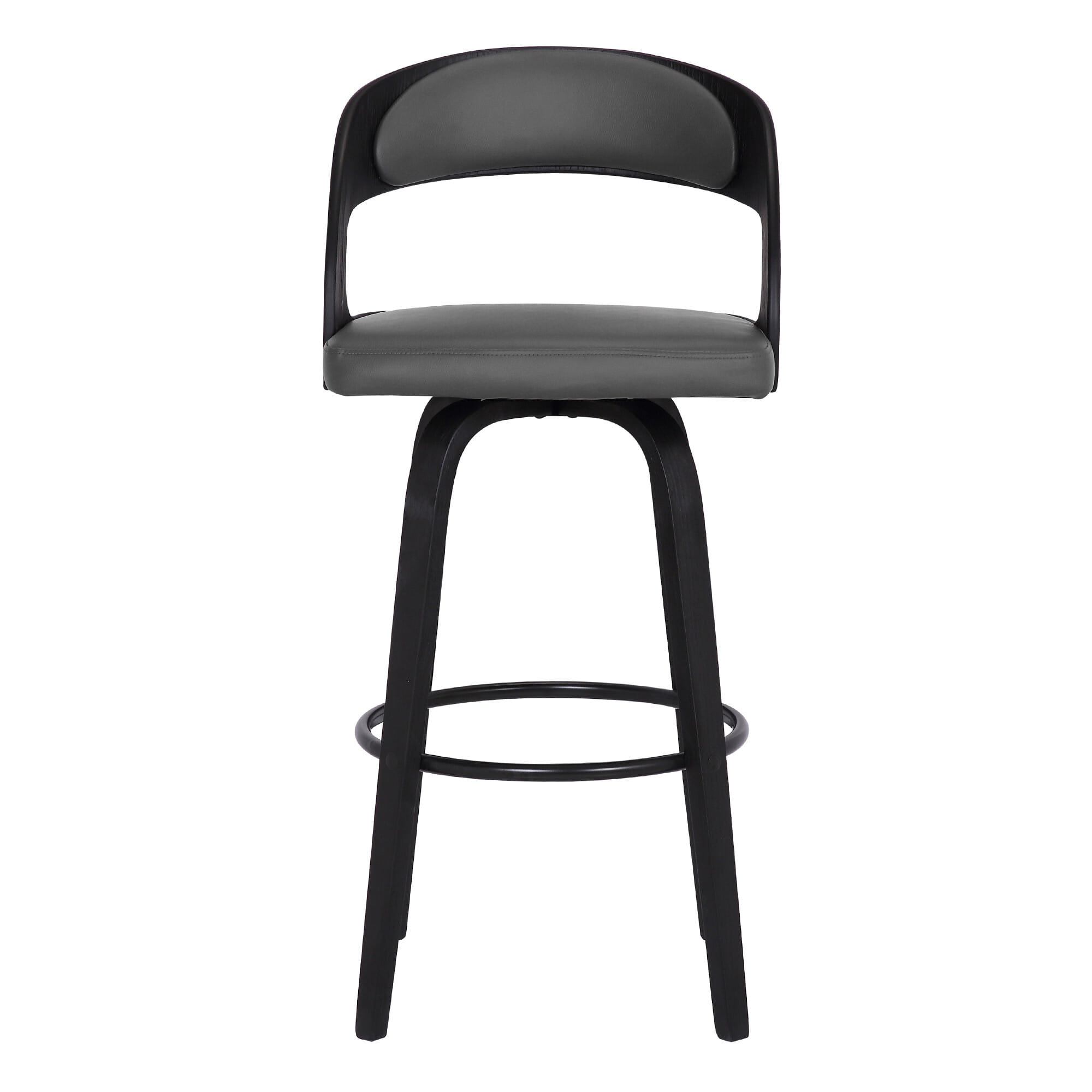 This exceptionally stylish and elegant Gray Faux Leather Modern Black Wooden Bar Stool is the perfect accent to your home with its classy chic vibe and modern essence. Showcasing a gray faux leather smooth-textured cushion and back, with a black wooden frame wrapped around, this bar stool exudes timeless beauty with a striking visual appeal. It features an ergonomic 360-degree rotatable function with footrest that allows to turn to any direction conveniently without moving. The stool also has an open chair back that allows a refreshing breathable seating experience and optimal comfort with the help of its plushy soft durable seat cushions. Thanks to its enchanting presence and functionality, this stunning bar stool is an absolute must-have whether it is for your kitchen, office, home bar or patio. 41″ x 18″ x 18″
