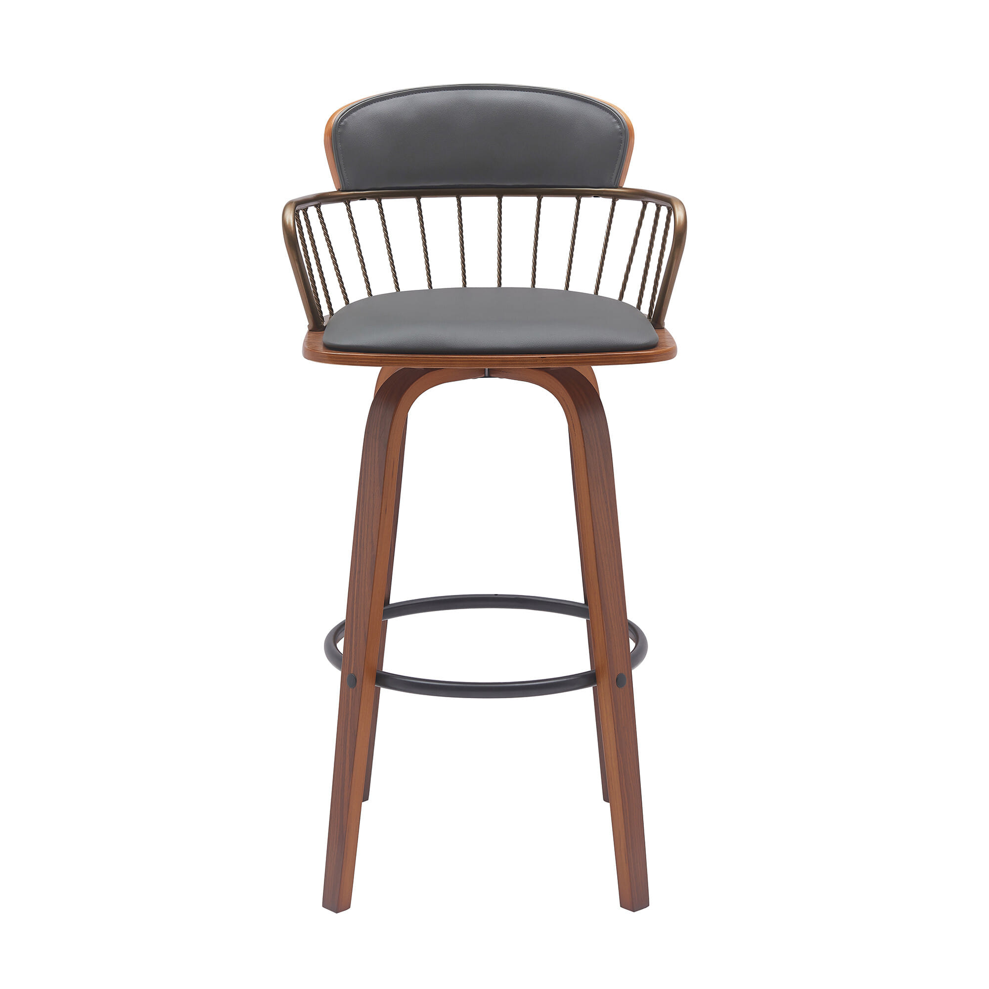 30″ Gray And Wood Brown Faux Leather Swivel Low Back Bar Height Bar Chair