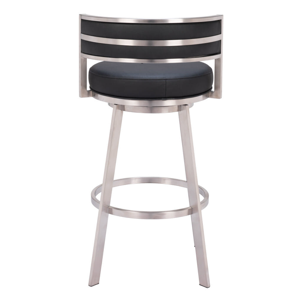 With this 31-inch black and silver faux leather and stainless steel low back bar height swivel bar chair you can add design and extra seating to your space. The silver coloration of the high quality stainless steel base marries nicely with the black faux leather seat. Not only good looking and stylish, this chair features a bucket shaped seat and a low back for the ultimate in comfort and enjoyment. Designed with a footrest for comfort and convenience. 38.2-inch H x 20.1-inch W x 20.1-inch D
