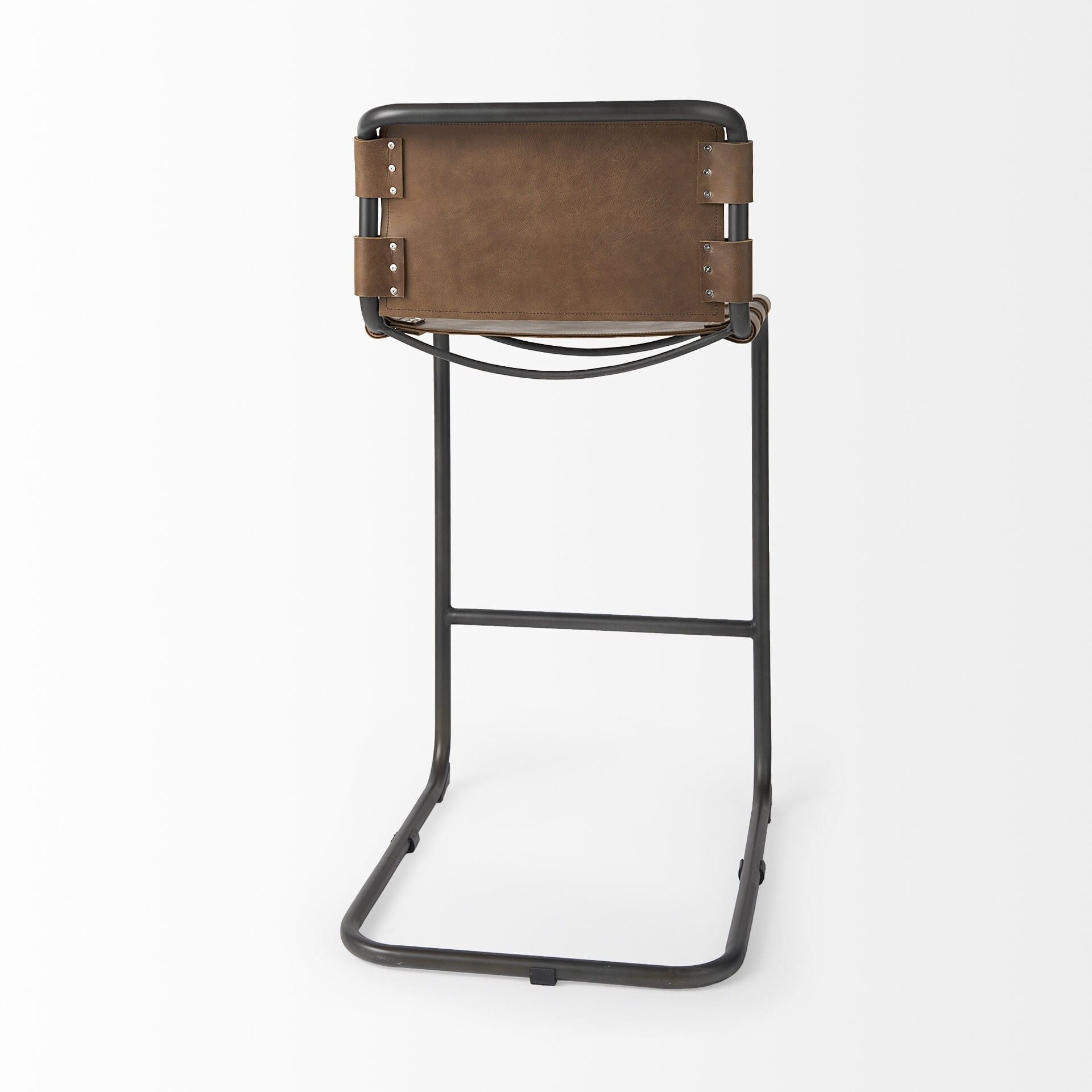 Sit comfortably and enjoy the sleek design of this 35-inch brown leather and steel bar chair. It features a full back for ultimate support and a footrest for added comfort. The seat height, measuring 35-inch from the floor to seat, ensures a perfect fit for your bar or counter. With its sturdy sled leg/base, this chair combines style and durability. Elevate your space with this chic bar chair, reminiscent of your favorite cafes or pubs. 42-inch H x 24.75-inch W x 20.5-inch D
