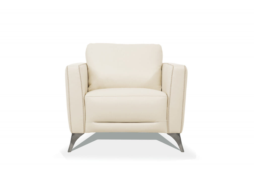 Fill your living room, bedroom, or office with fashionable seating options with this 35″ cream genuine leather and black arm chair. This gorgeous solid color cream arm chair is masterfully upholstered in durable genuine leather. 31″ H x 35″ W x 34″ D