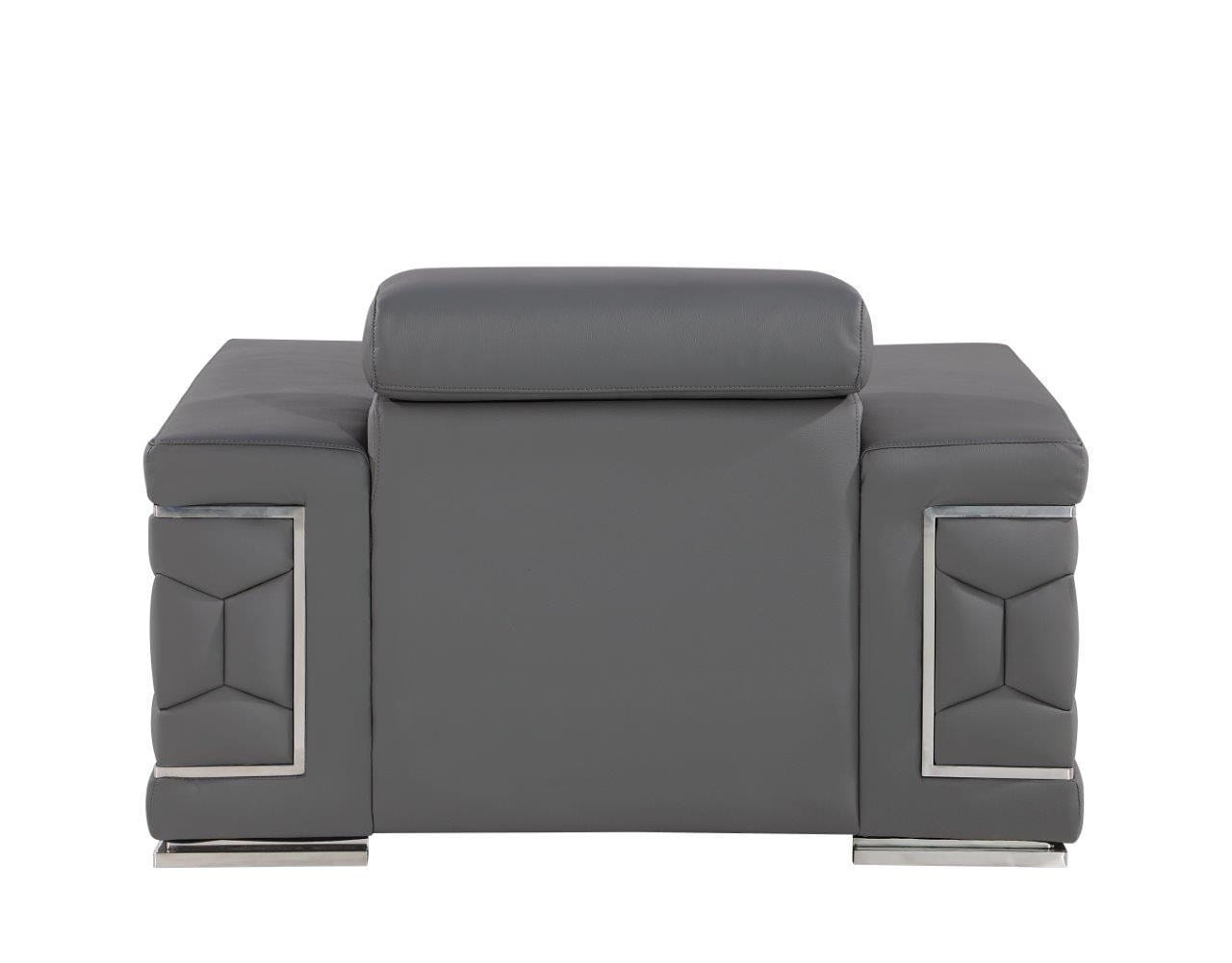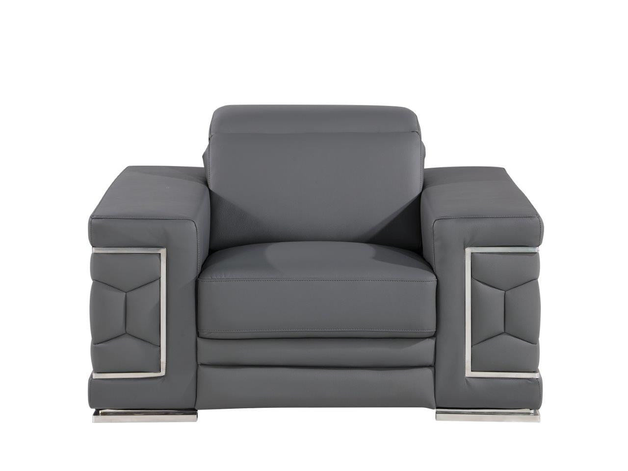 Unique and decorative, this 47-inch dark gray and silver genuine leather lounge chair will leave a lasting impression. This modern and contemporary wide lounge chair is masterfully upholstered with genuine Italian leather and accented striking silver stainless steel. A high quality solid wood inner frame gives this chair a sturdy base. Flaunting wide and comfortable armrests and a tight back, this chair is ready to be a striking addition to your space. 39-inch H x 47-inch W x 41-inch D