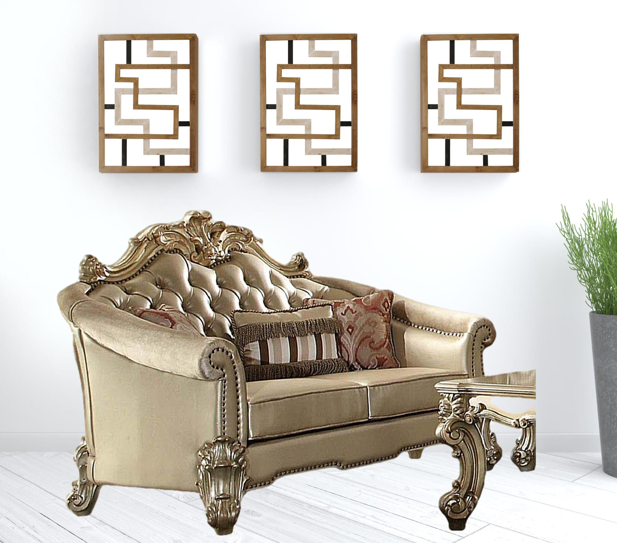 With a look and feel like leather, this 67-inch bone and gold faux leather loveseat and toss pillows is made from sturdy and resilient faux leather to stand up to the test of time. Square arms offer a comfy place to rest and give this piece some interest and shape. A great showpiece for your room, this sofa is a must have. 48-inch H x 67-inch W x 44-inch D