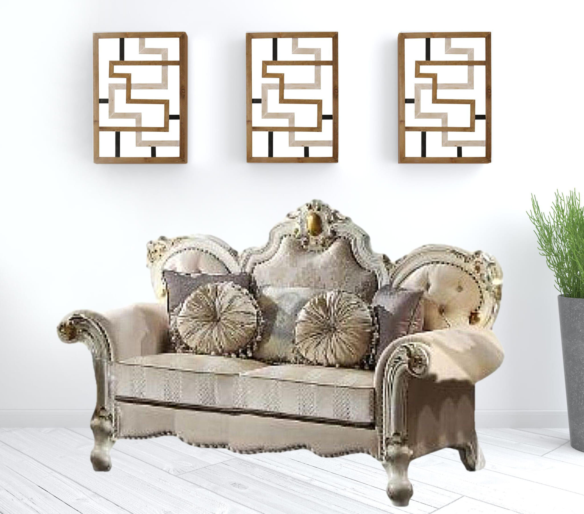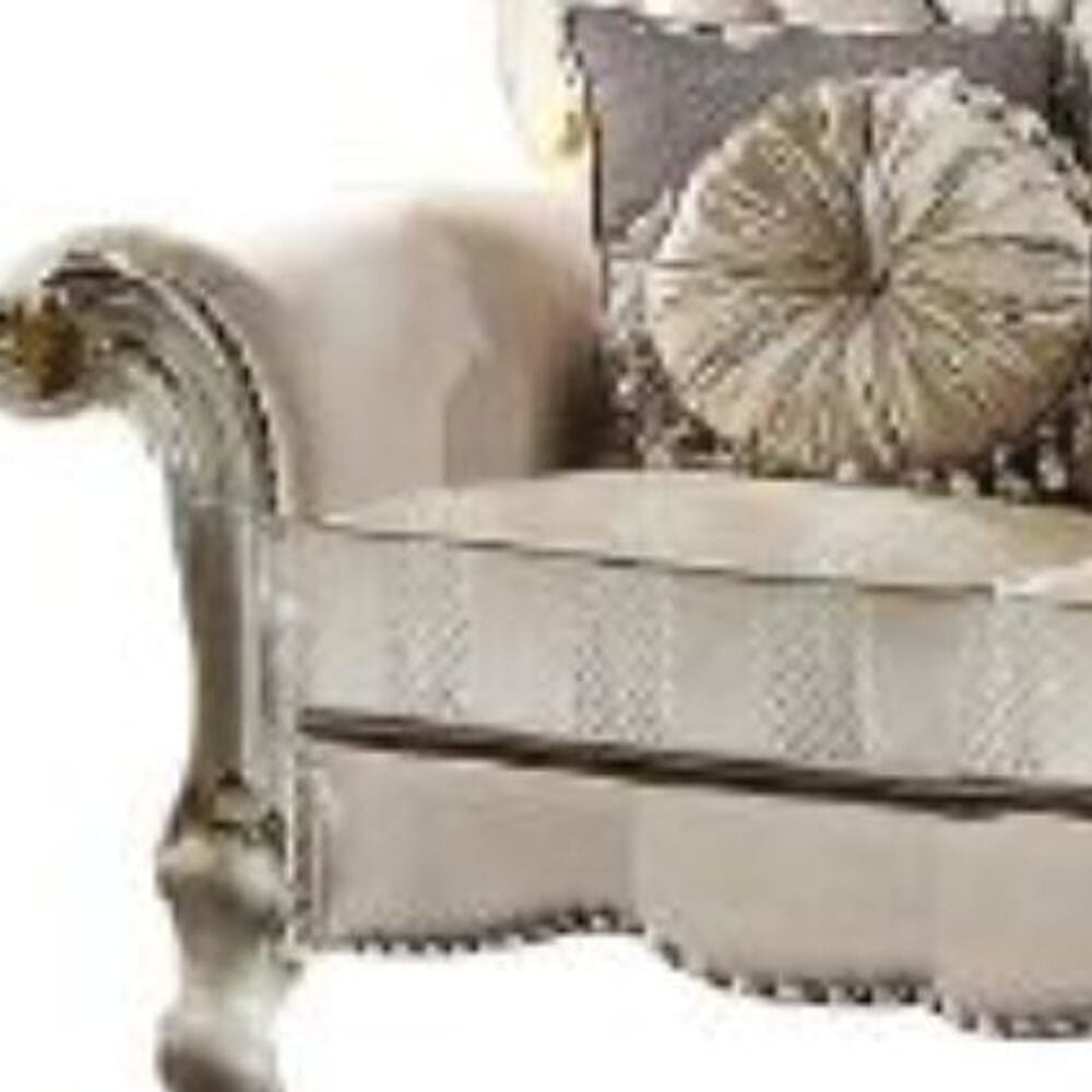 Transform your living space with this elegant 70-inch gold velvet loveseat featuring tufted cushions and square arms. Wrapped in luxurious solid color velvet upholstery complemented by pearl legs, this loveseat exudes sophistication. The piece includes five toss pillows, adding an extra layer of comfort and style. Ideal as a central showpiece in any room, this rectangular loveseat is a must-have addition to your home décor collection. 48-inch H x 70-inch W x 38-inch D