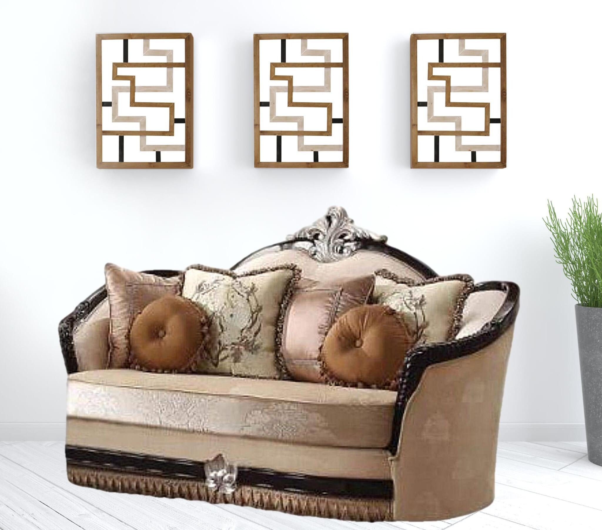 Add an air of fashion to your space with this fabulous 75-inch tan velvet curved loveseat and toss pillows. The square arms offer a comfy place to rest, and the solid and manufactured wood legs in a matching tan color provide sturdy support. Upholstered in a solid color velvet, this loveseat boasts a unique curved shape that adds interest and style to any room. Complete with six included toss pillows, this showpiece is a must-have addition to your home. 48-inch H x 75-inch W x 41-inch D
