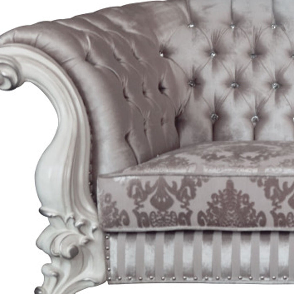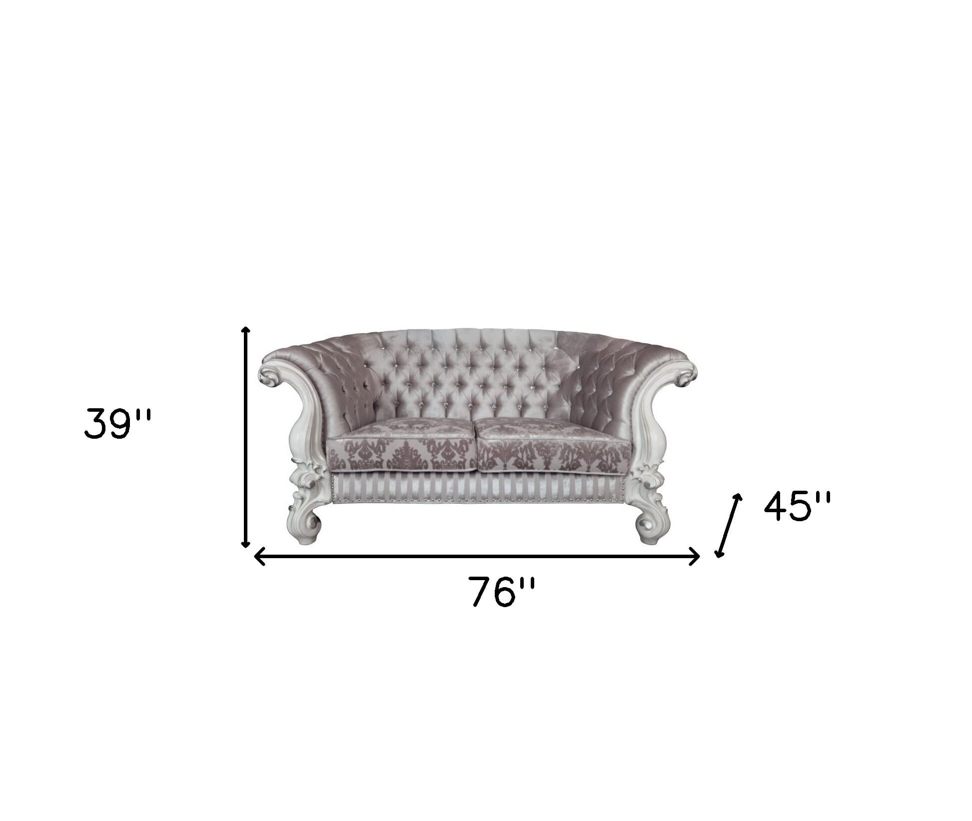 Add an air of fashion to your space with this fabulous 76-inch ivory and off white velvet loveseat and toss pillows. Rolled arms offer a comfy place to rest and give this piece some interest and shape. A great showpiece for your room, this sofa is a must have. 39-inch H x 76-inch W x 45-inch D