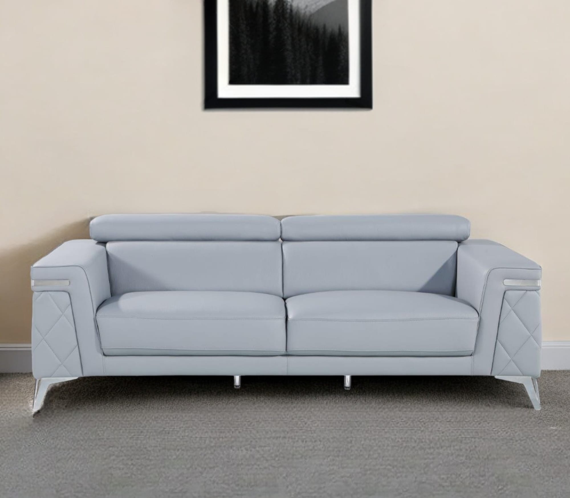 Made of the highest quality, supple leather, this 89-inch light blue italian leather sofa with silver legs will be the star of your space. The high grade premium leather used makes your lounging luxuriously comfortable and adds an elegant appeal to your space. Solid colors give you lots of decorative options and are easy to work into your decor scheme. Sinuous springs construction gives this piece strong support and makes it comfortable to sit even for long periods of time. Square arms offer a comfy place to rest. Silver stainless steel legs effortlessly elevate the room and add a touch of contemporary design. Built to last, this sofa will be a great centerpiece for your room. 42-inch H x 89-inch W x 38-inch D