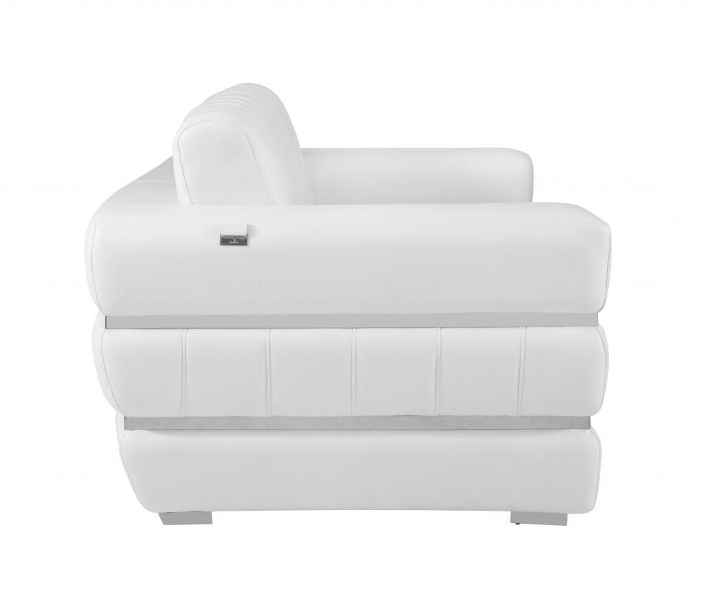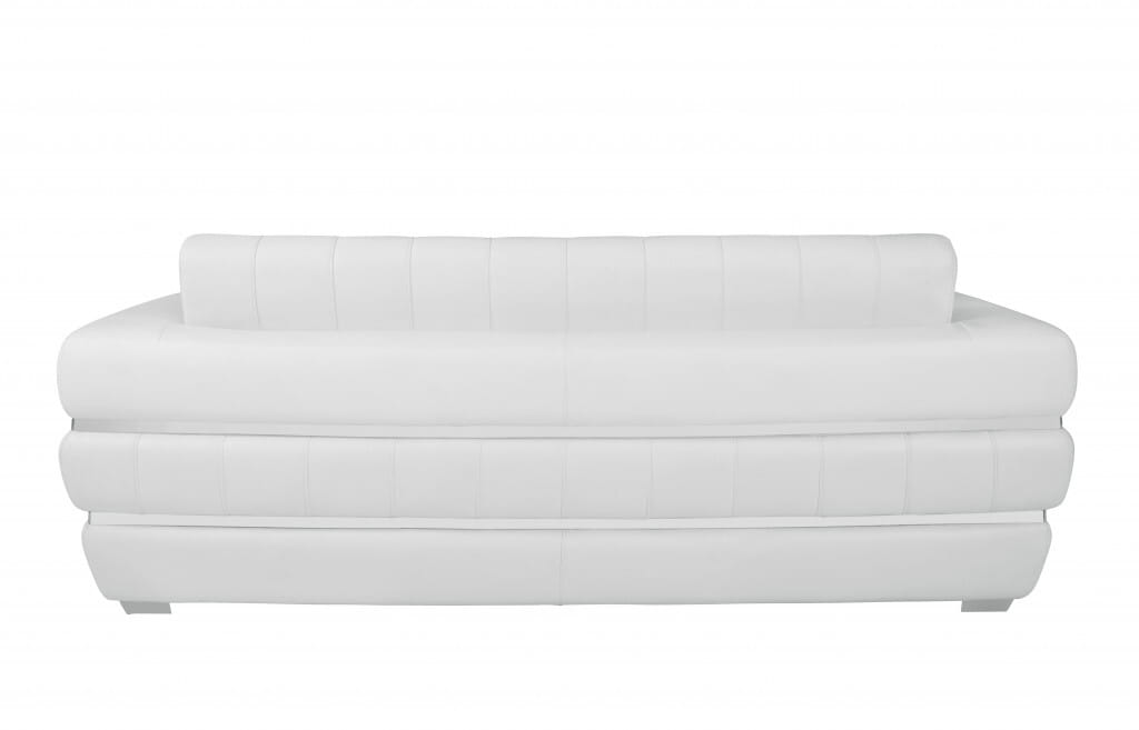 Made of the highest quality, supple leather, this 89-inch white italian leather sofa with silver legs will be the star of your space. The high grade premium leather used makes your lounging luxuriously comfortable and adds an elegant appeal to your space. Solid colors give you lots of decorative options and are easy to work into your decor scheme. Web suspension construction gives this piece strong support and makes it comfortable to sit even for long periods of time. Square arms offer a comfy place to rest. Silver stainless steel legs effortlessly elevate the room and add a touch of contemporary design. A great showpiece for your room, this sofa is a must have. 35-inch H x 89-inch W x 44-inch D