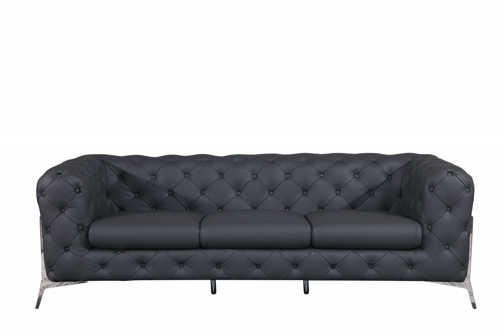 Made of the highest quality, supple leather, this 93-inch dark gray italian leather chesterfield sofa with silver legs will be the star of your space. The high grade premium leather used makes your lounging luxuriously comfortable and adds an elegant appeal to your space. Solid colors give you lots of decorative options and are easy to work into your decor scheme. Web suspension construction gives this piece strong support and makes it comfortable to sit even for long periods of time. Square arms offer a comfy place to rest. Silver stainless steel legs effortlessly elevate the room and add a touch of contemporary design. Built to last, this sofa will be a great centerpiece for your room. 31-inch H x 93-inch W x 38-inch D