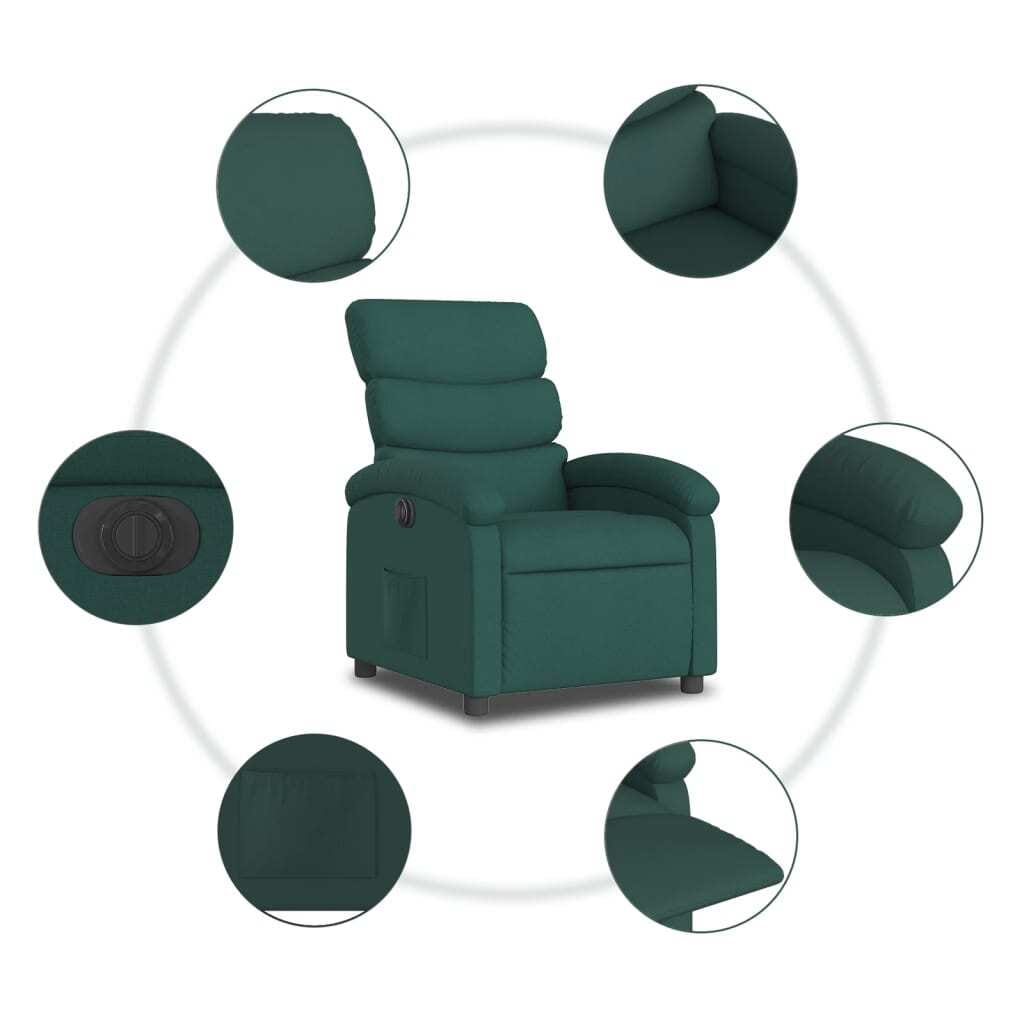 This electric recliner chair in dark green fabric brings stylish comfort to your space, offering an amazing relaxation experience. With plush cushioning and sleek lines, it fits right into any decor, perfect for unwinding with your favorite shows or enjoying some downtime with a good book.