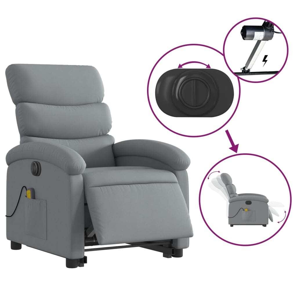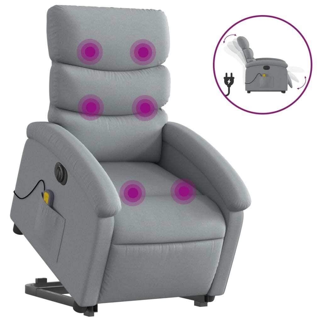 This electric stand up massage recliner chair mixes modern comfort with awesome functionality, designed to amp up your relaxation. Dressed in slick light gray fabric, it fits right into any room, welcoming people of all ages to chill out in comfort.
