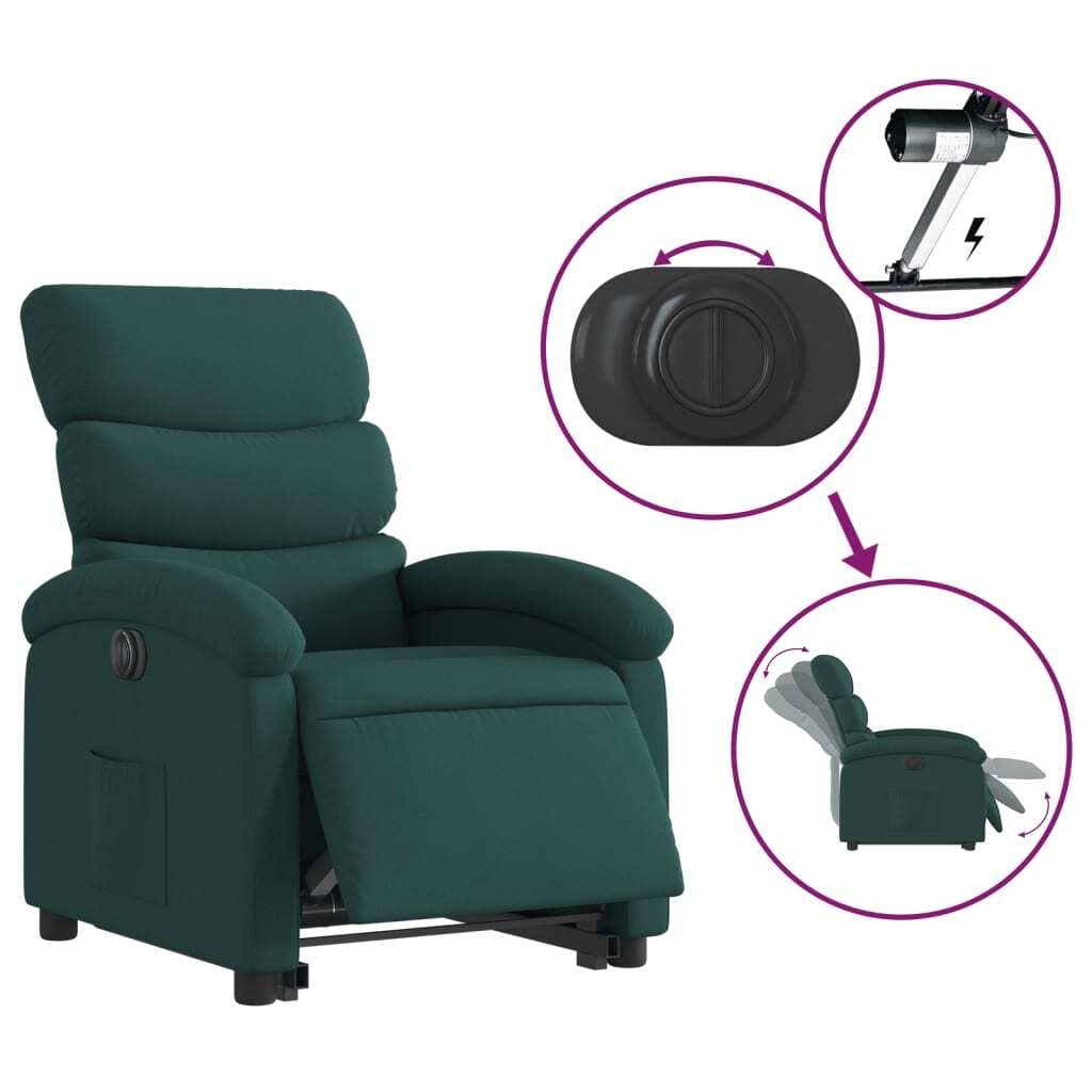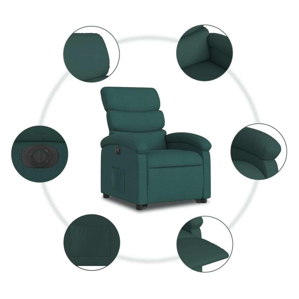 This electric stand-up recliner chair is the perfect mix of comfort and functionality, mainly designed for indoor use in the living room or home theater, making it an awesome seating solution for relaxation and chill time. With its dark green fabric upholstery and sleek, modern design, it looks great in any decor, while its ergonomic shape and soft padding give you fantastic body support, letting you unwind easily after a long day.