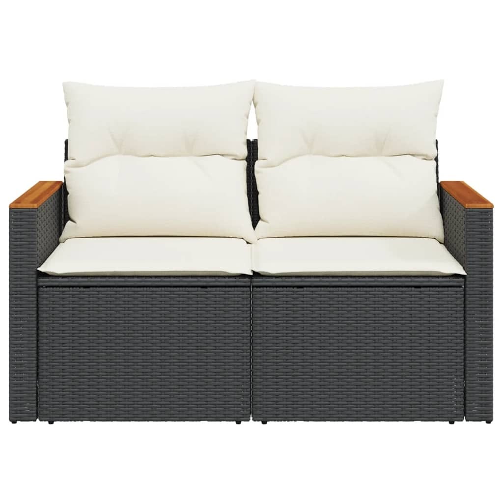 This 2-seater garden sofa is made from top-notch poly rattan and powder-coated steel, making it a stylish and sturdy option for your outdoor space. Its sleek black color, paired with creamy cushions, effortlessly enhances any area from patios to balconies, perfect for relaxing and socializing.