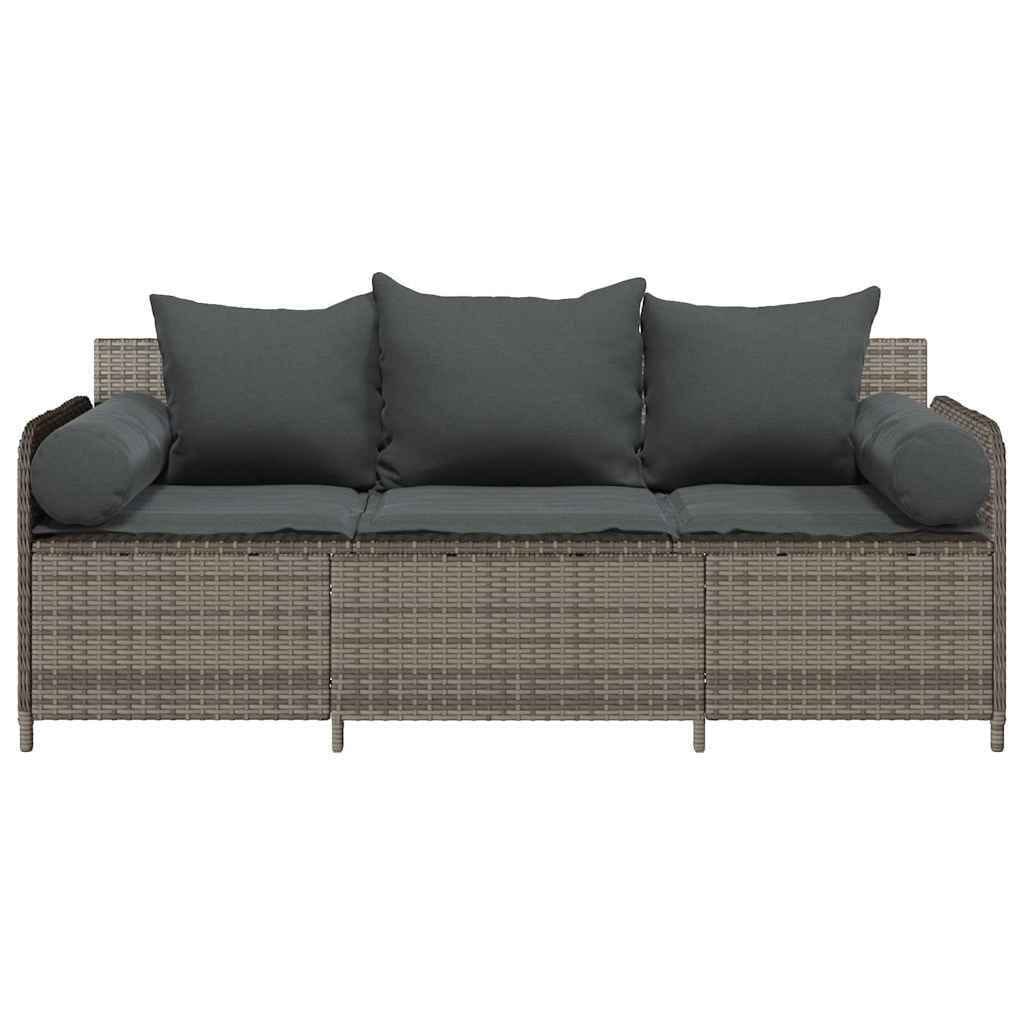 This Garden Sofa is a stylish outdoor seating option designed for relaxation and socializing on your balcony or patio. With its sleek grey rattan construction and comfy cushions, it adds a modern touch to various outdoor settings while providing ample room for three adults to lounge comfortably.