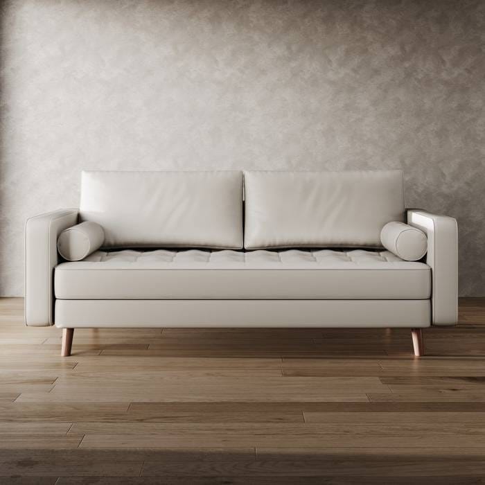 Upholstered in supple faux leather, this Ivory Upholstered Faux Leather Sofa w/ Pillows Solid Hardwood Legs offers a plush seating experience that is both cruelty-free VEGAN and environmentally conscious. Its sleek silhouette and tailored stitching enhance any living space, while the generous seating area provides ample room for relaxation or cozy gatherings. Perfectly sized at 70 inches wide, this sofa is an ideal choice for apartments, lofts, or smaller living rooms seeking a touch of sophistication and comfort. Assembly is a breeze and takes 15 minutes of less!
