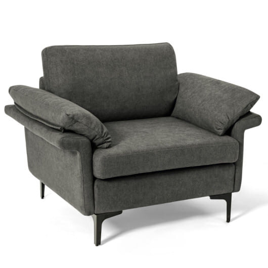 ● Upholstered accent chair with soft lint/linen fabric offers comfort and style.
