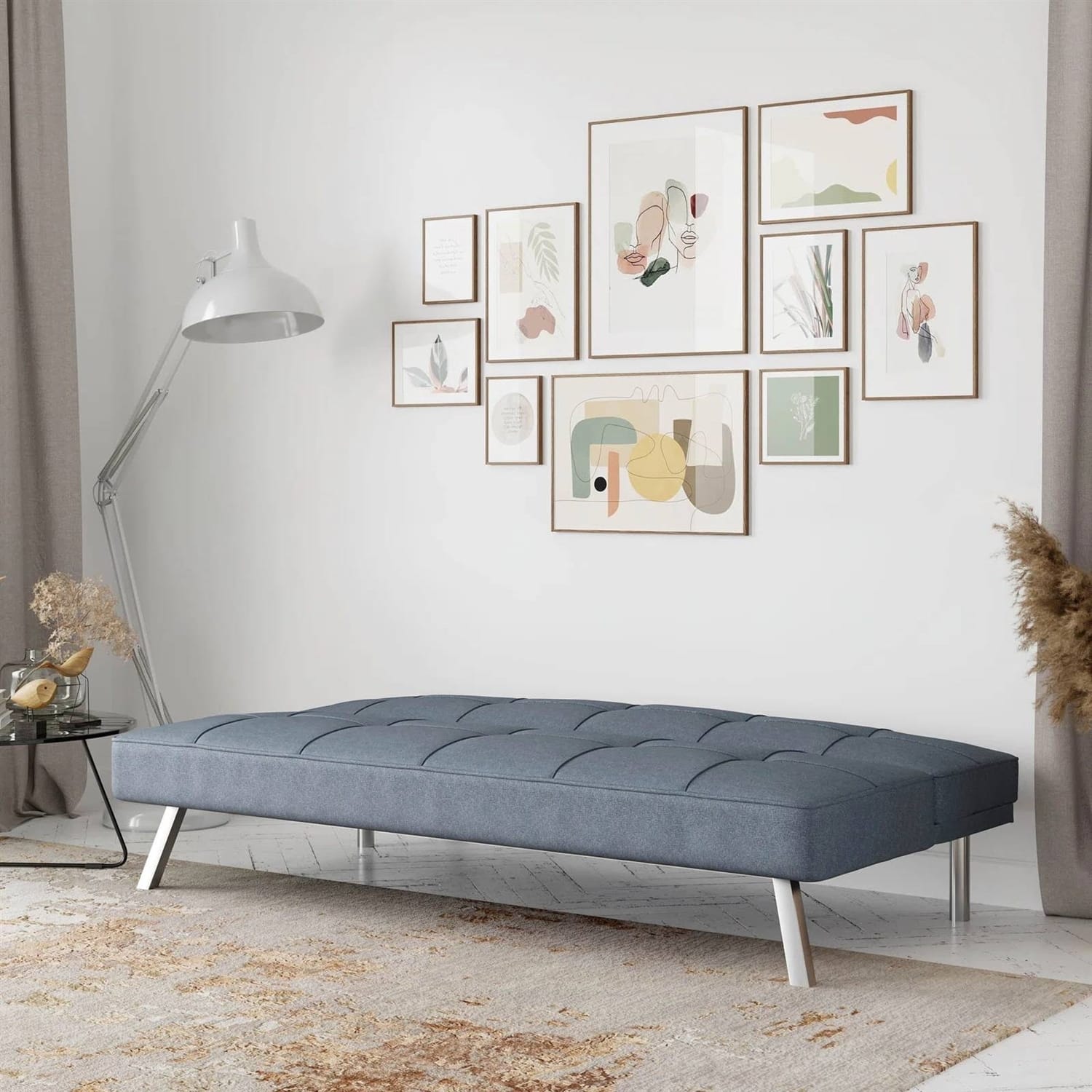 - Modern Futon Sofa Bed in Light Gray Fabric with Chrome Metal Legs