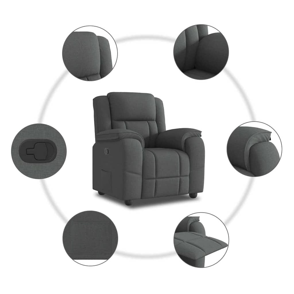 This recliner chair is all about relaxation and comfort, perfect for diving into a good book or enjoying a movie in your home. Its sleek dark grey fabric gives it a modern edge, and the plush armrests add to the relaxing vibe.