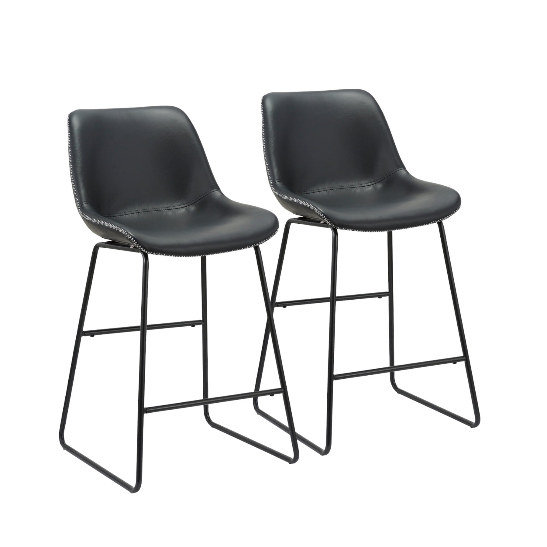 The perfect way to add some extra seating in your home, this set of two 26-inch black faux leather and metal low back counter height bar chairs will elevate the look and vibe of your room. A solid black metal frame is finished off with a matching black faux leather seat, giving this chair a chic monotone look. Not only good looking and stylish, this chair features a bucket shaped seat and a low back for the ultimate in comfort and enjoyment. Designed with a footrest for comfort and convenience. 38-inch H x 21-inch W x 20-inch D