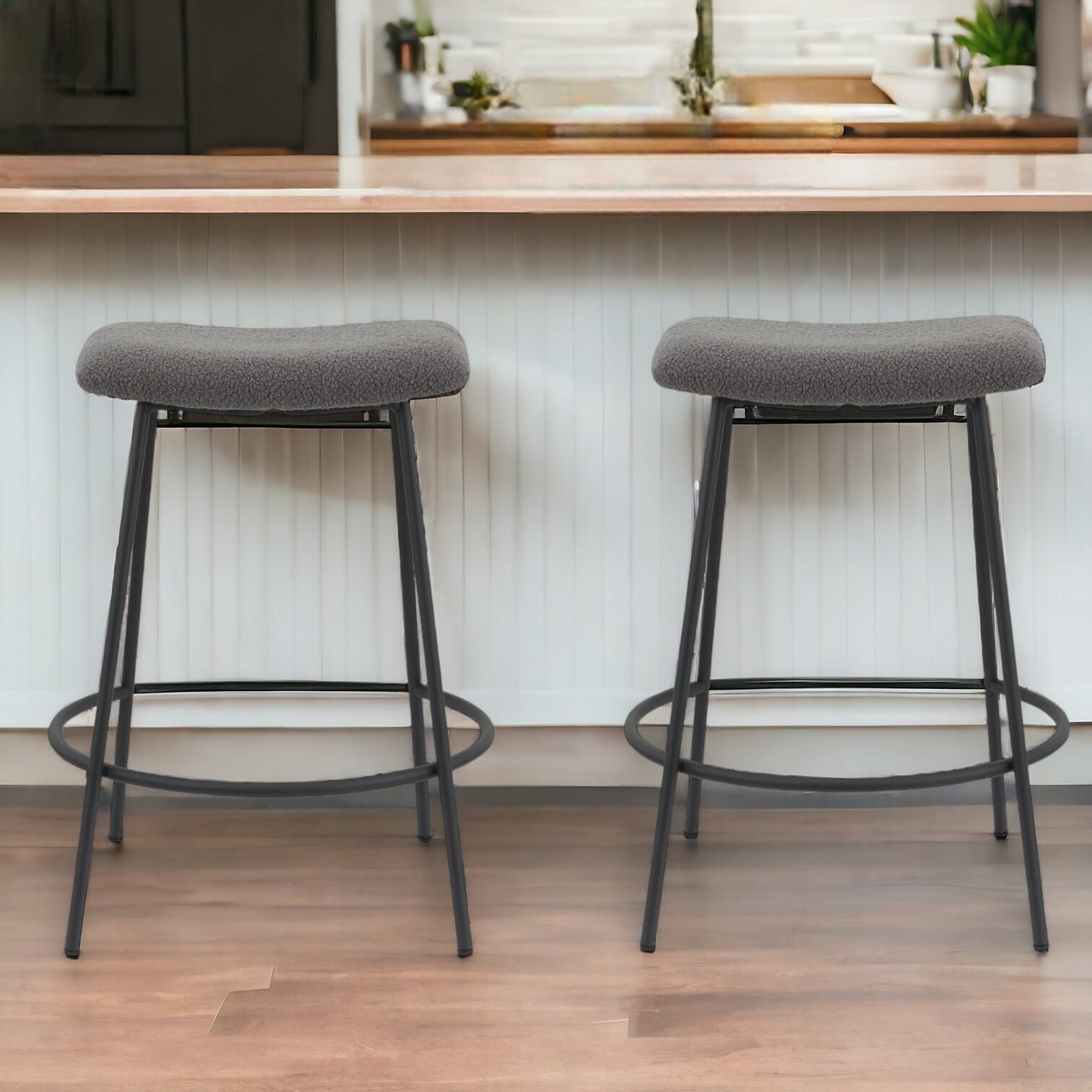The perfect way to add some extra seating in your home, this set of two 26-inch gray and black backless counter height bar chairs will elevate the look and vibe of your room. The base of this stool is made from metal in a black color that is a nice contrast to the soft and cushiony gray faux sherpa fabric seat. A backless mixed with a rectangle shaped seat makes this chair both comfortable and fashionable. Designed with a footrest for comfort and convenience. 25.5-inch H x 19.5-inch W x 19.19-inch D
