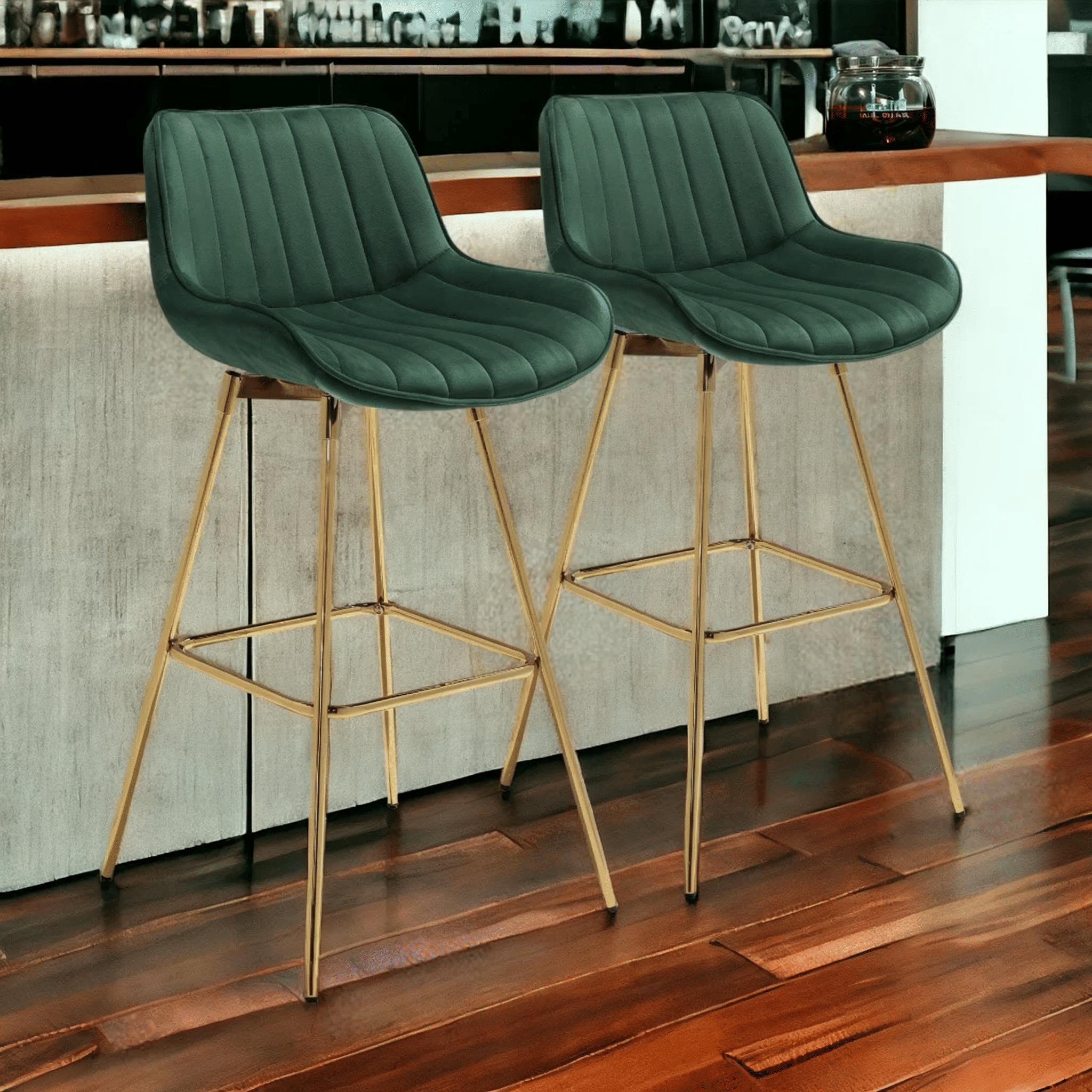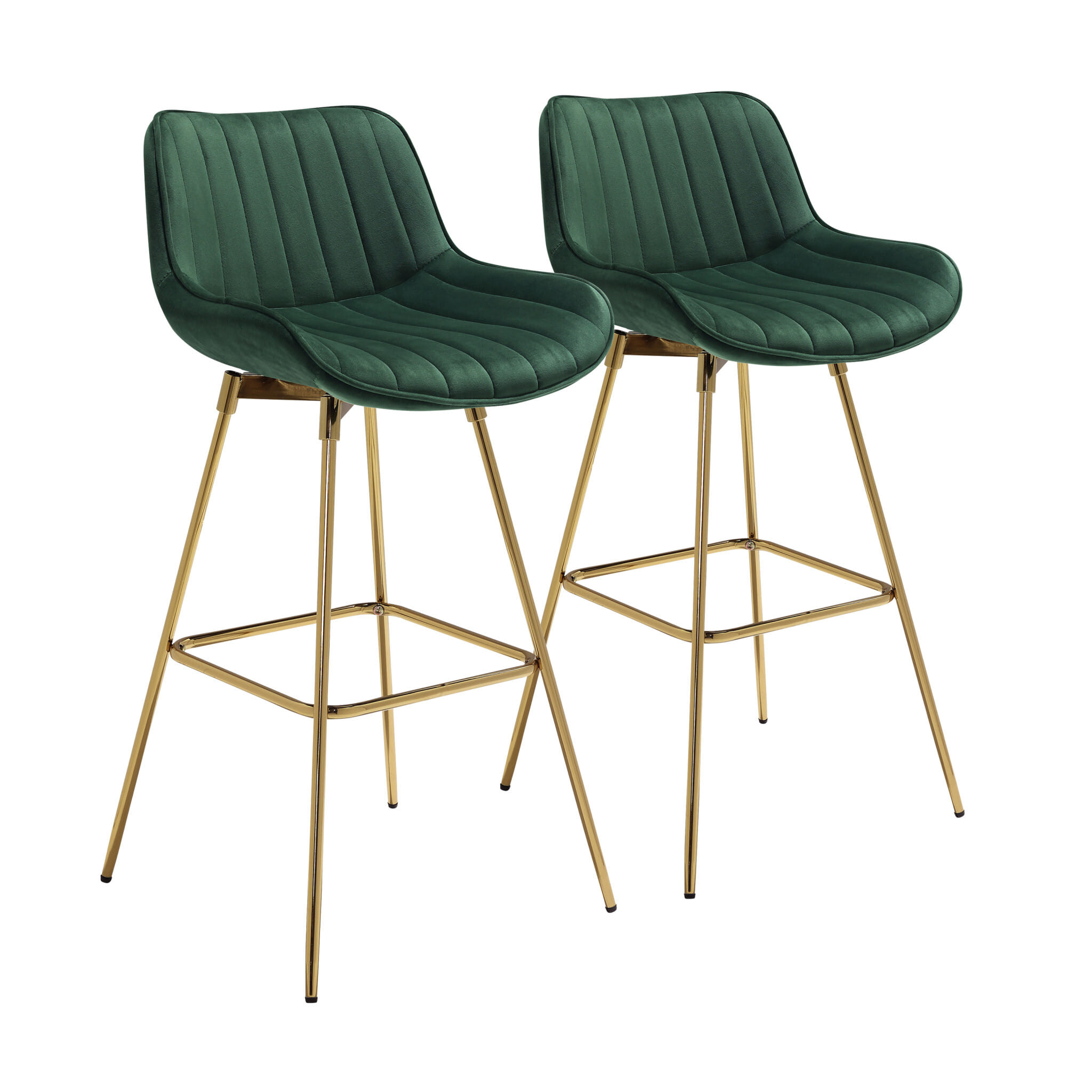 Comfort and design come together nicely in this set of two 29-inch green and gold velvet and metal low back bar height swivel bar chairs. Quality construction from gold metal combines with green velvet to give this stool a fresh and updated look. The bucket shape of the seat combines with a low back to give this chair a comfortable and fashionable look. Designed with a footrest for comfort and convenience. 38.19-inch H x 19.29-inch W x 19.09-inch D