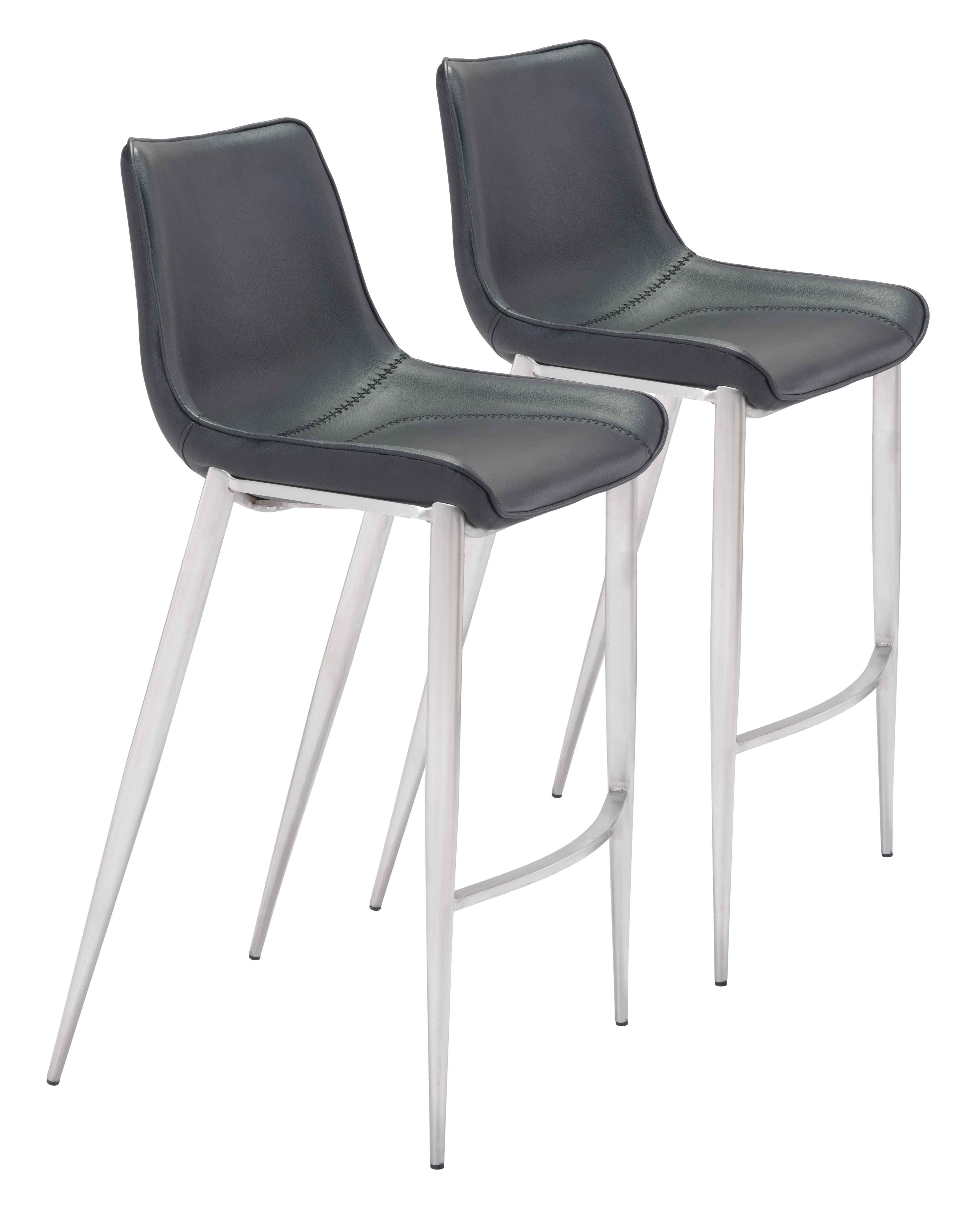 With this set of two 30-inch black and silver steel low back bar height bar chairs you can add design and extra seating to your space. The base of this stool is made from steel in a silver color that is a nice contrast to the black upholstered seat. The bucket shape of the seat combines with a low back to give this chair a comfortable and fashionable look. Designed with a footrest for comfort and convenience. 43.3-inch H x 20.7-inch W x 21.7-inch D