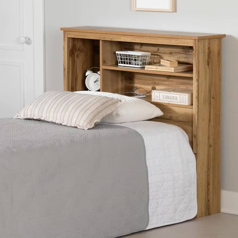 Your books and knick-knacks will find their place in this Twin size Modern Scandinavian Style Bookcase Headboard in Oak Wood Finish. Equipped with a grommet hole, it will even allow you to plug in your phone and tablet without visible wires. YouÂ’ll love its 3 open storage spaces with a solid and resistant fixed shelf.